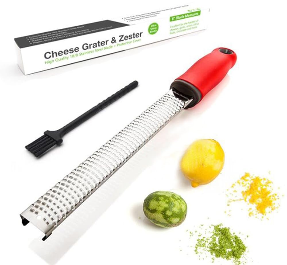 • The Brilliant Mart Stainless Steel Grater, Sharp Blade Zester with Safety Cover and Cleaning Brush for Lemon,Ginger,Cheese,Garlic, Red Handle is a