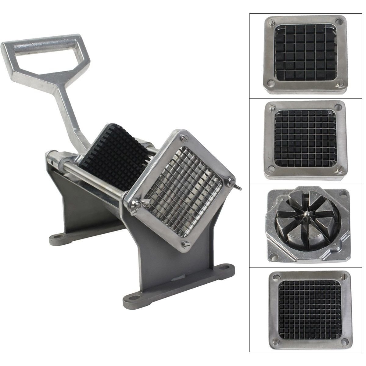 Gracelove Potato French Fry Fruit Vegetable Cutter Slicer Commercial Quality W 4 Blades is best for youStainless steel blades, aluminum alloy knife rest, long service life Blade sizes: 1/4', 1/2', 3/8' and 4th blade for slicing oranges and apples (8-cut) With ergonomically designed handle,efficiency is 10 times of hand processing The sturdy legs provide more stability while mounting the cutter on any flat surface Does not take up much space on your countertop Extra Long lever for maximum push with minimum effort Fully Mountable Wall or Table, Can also stand on its own without mounting Easy for installation. Easy Cleaning Stainless Steel Cutting Frames and Pushing Blocks Weight: 11lbs