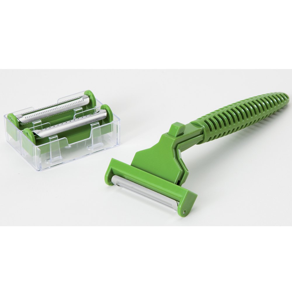 Bits and Pieces - Multi Function Vegetable/Fruit Shaver and Peeler - Kitchen Accessory Multitool is best for youClever as it is functional, this handy vegetable peeler is 6” long and comes with 3 different cutting blades that look like razor cartridges. Regular peel, serrated, and curler.