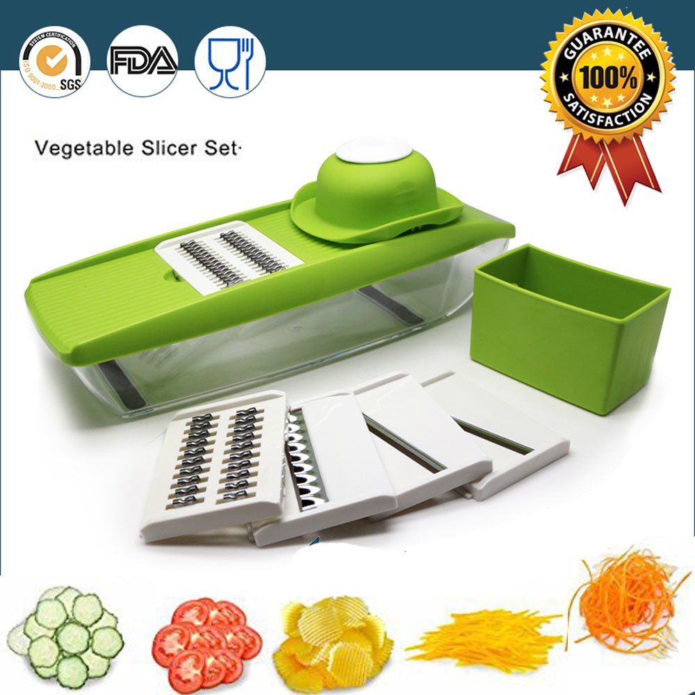 Mandoline Slicer Adjustable Mandoline with 5 Thickness Settings Interchangeable Stainless Steel Blades -Vegetable Peeler Slicer+One Clean Brush, Food Container is best for youProduct DescriptionDID YOU WANT TO SAVE TIME SLICING YOUR VEGETABLES or FRUIT, BUT STILL MAINTAIN THAT CONSISTENT CUT? We will brings you the solution:5 Interchangeable Stainless Steel Blades Mandoline Slicer- Perfect for Slicing and Dicing a Wide Variety of Fruits and Vegetables!WHAT YOU WILL GET: • Detachable Mandoline slicer• Food container base to catch all your cuts! • Mandoline Slicer has 5 interchangeable stainless steel blades• Put more one white clean to clean the mandoline slicer brush• Straight slicer-perfect for slicing fresh cucumber or thinly cut potato chips! • Grater - for your cheeses or carrots• Fine grater - Ideal for grating garlic, ginger, nutmeg or even chocolate! • Julienne Slicer - for beautifully consistent vegetable / French Fry strips - similar to spiralizer for noodle / spaghetti like vegetables• Safety hat offering protectionFEATURES: •5 thickness settings to get the perfect cut - 2.5mm, 1.5mm & 2.0mm,3.0mm,Flat-v Slicer thick• Food container helps to keep all cuts together•Including a handle helps to keep blades secureEASY TO CLEAN AND SAFETY AND USEFUL: Please use the white clean brush to clean your Mandoline slicer, the slicer location is very compact, so it is very safety. Use the fine grating blade to grate ginger, garlic, nutmeg, chocolate, etc. Use the crude grating blade to grate carrots, cheeses, etc.The choices are many.
