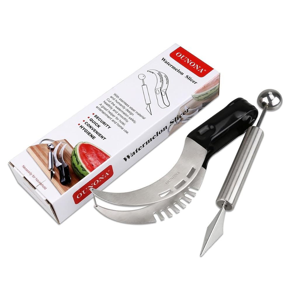 OUNONA Watermelon Slicer Server Knife Cutter Corer Scoop Stainless Steel Tool is best for youDescription This watermelon slicer will help you make perfect melon slices every time without the effort of cleaning your kitchen and dinner table afterwards. Few things are as messy as cutting watermelons because of its high watermelon contents that floods from the cutting board to the table beneath. That's the beauty of this watermelon knife, you only need to cut the melon in half then the messy part is finished without you needing to clean everywhere. Besides, it is easy to use and perfect serving to the guests during the summer dinners and parties.