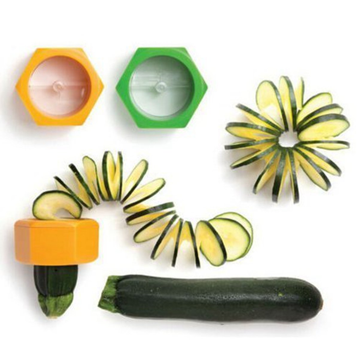 Pinovk 2pcs Cucumber Peeler Vegetable Slicer Fruit Kitchen Tool Good Quality Gadget is best for youFeatures: 100% Brand New Material: plastic Size:appr 7*4cm(2.76*1.57in) Color: as shown by photos ,random ship The Cucumbo has been designed like a bolt with a spiral thread in the centre. You poke the start of the spiral thread into the centre of the cucumber and then twist. Holding the furthest end of the vegetable - the plastic blades in the centre then slice the cucumber or courgette into a perfect, continuous spiral. Package Includeï¼?2X Cucumber Peeler