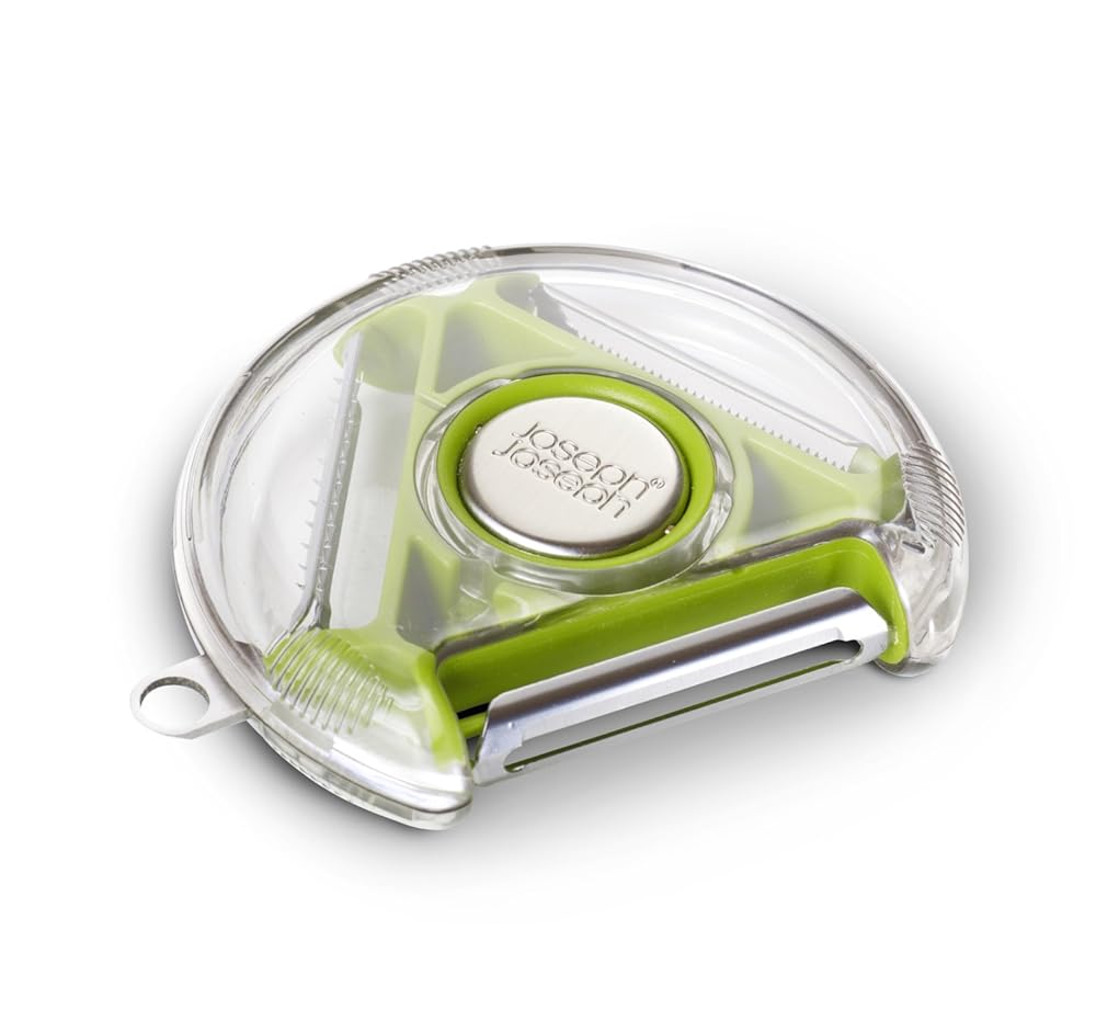 Joseph Joseph PEBG0100CB Rotary Peeler Compact 3-in-1 Blades Standard Serrated Julienne Potato Eye Remover Plastic Dishwasher-Safe, Green is best for youColor:Green Consolidate all the peelers you want and need into one tool with Joseph Joseph's Rotary Peeler. This compact peeler has three stainless steel blades for three different uses. The standard blade is perfect for potatoes and carrots, the soft skin blade can be used on tomatoes and kiwi and the Julienne blade provides lovely Julienne peels, and can be used on just about any fruit or vegetable. With its twist dial, changing blades is quick and easy. Designed for both right and left handed use. Unclip case for easy cleaning; dishwasher safe. Peeler also features a stainless steel eye remover. By Joseph Joseph.