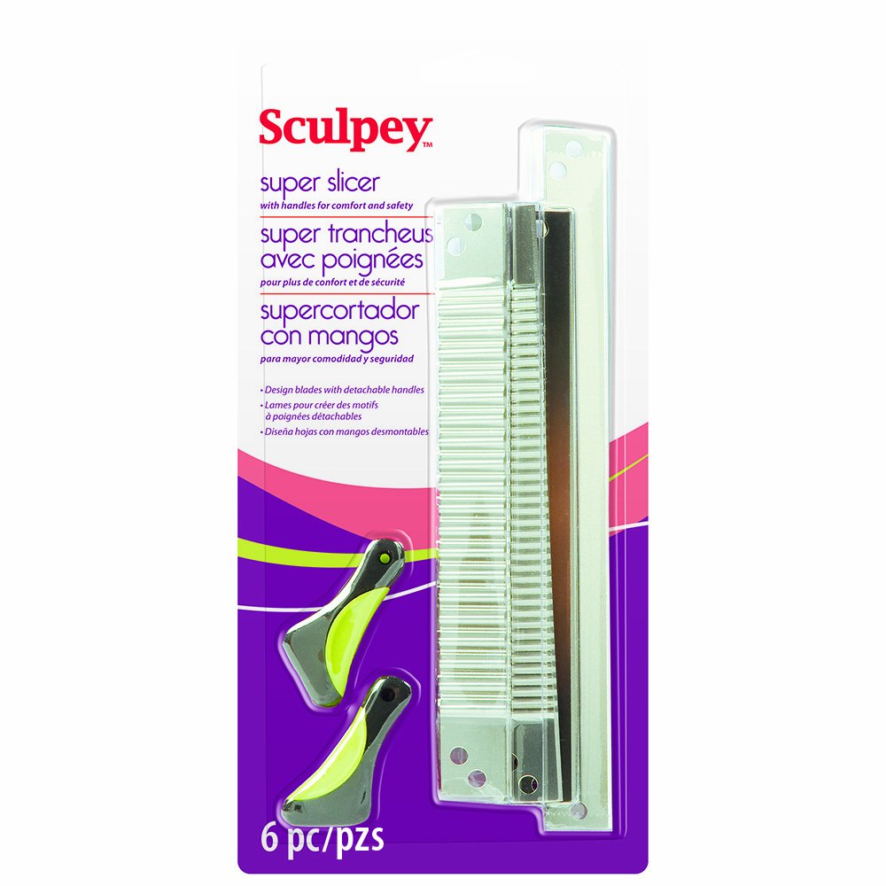 Polyform Sculpey Super Slicer is best for youPOLYFORM-Sculpey Super Slicer Set. This set contains four blades for slicing clay and creating a variety of design edges or cuts. Safety handles that snap off for use on all blades are also included. This package contains two safety handles and four metal blades: Rigid; Flexible; Rick Rack; Wave. Caution: Blades are extremely sharp. Handle with care. Imported.