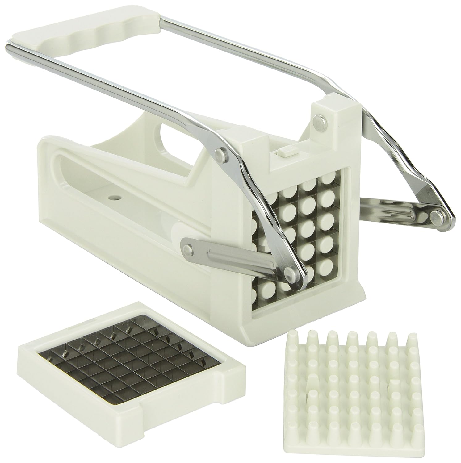 Prepworks by Progressive Vegetable and French Fry Cutter is best for youProduct Description Progressive International is your source for the widest range of functional, inventive and fun kitchen tools and great ideas put into practice. Our gadgets, tools, food-prep items and household products make cooking and meal preparation more efficient and fun. At Progressive, passion and creativity unite to create the right balance of form and function for today's cooks. Our in-house designers spend hours in the kitchen coming up with ways to improve on a variety of traditional tasks and tools. Established in 1973, our commitment to quality and service allows us to offer a broad selection of quality kitchenware and other household products. Progressive holds product patents worldwide and has gained respect as a world class kitchenware innovator. Prepworks from Progressive International is a line of products created by people who understand having the correct kitchen tool can make your cooking experience more enjoyable. Prepworks - essential items for today's cook. Use this Prepworks vegetable/french fry cutter for french fries and vegetable sticks. Simply place the vegetables and small or half potatoes into the chute and press through for thick and thin pieces. The stainless steel blades are interchangeable: 25 holds for large and 49 holes for small. It features an easy to operate lever action for all your cutting needs. Hand wash. Amazon.com This lightweight cutter divides a potato into its french-fry essence in a jiffy. One blade creates up to 49 3/8-inch fries with a single lever-push. The other creates up to 25 half-inch fries. You'll get those numbers, however, only if you precisely shape a large potato to fit the bed. The bed's size is the cutter's only drawback. Even if you cut a large potato to fit the head, the fry length is at most 3-1/2 inches. That length, however, is ideal for carrot, cucumber, and zucchini batons to assemble a vegetable tray around a bagna cauda, an Italian dipping sauce of olive oil, butter, garlic, and anchovies. And such batons get you halfway to a pretty dice for a vegetable soup. Hand wash. --Fred Brack