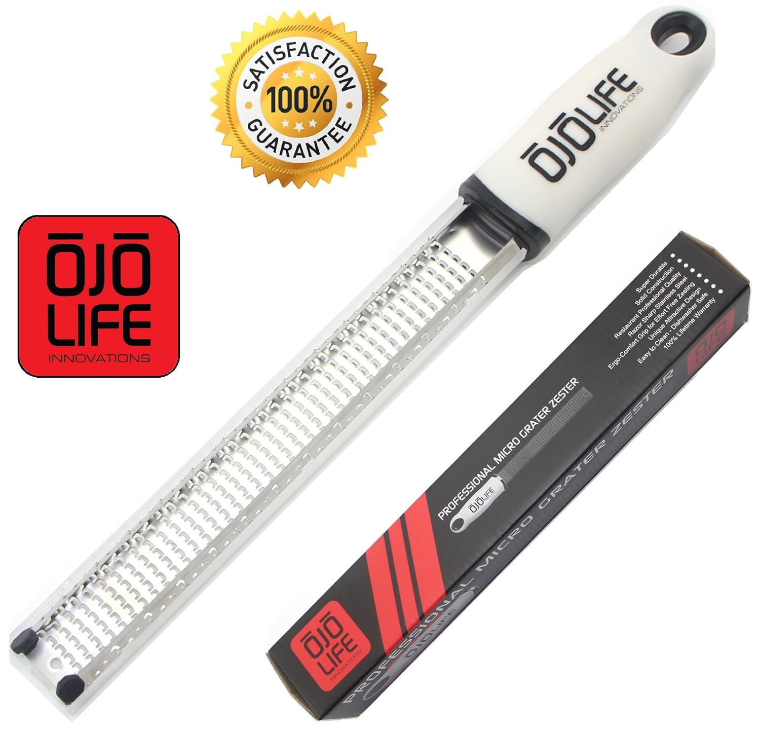 Super Durable Premium Quality MicroPlane Grater Lemon Zester - Multi Use Shredder - Complemented with E-Cookbook - White Rubberized Non Slip Handle & Razor Sharp Stainless Steel by OjoLife Innovations is best for youHow many kitchen gadgets have you purchased throughout the year only to have it become part of a growing collection of latest and greatest thingamajigs - aka JUNK? Well, OjoLife Innovations Micro Grater Zester will be the start or addition of useful, convenient and innovative gadgets that will get used often. Whether you're planning to make Grandma's famous apple pie, a nutritious fruit smoothie, a scrumptious pasta dish or salad, or just munch on a healthy snack, OjoLife Innovations is your new go-to gadget. The ease of grating and zesting without the stress of dealing with sharp knives or box graters makes it handy for every level of kitchen chef. Our line of products are designed specifically for the busy lifestyle we lead and the quick prep that we need. This Micro Grater Zester is ergonomically designed for comfort with a rubberized BPA-Free ergonomically molded handle. The stainless steel blades are razor sharp and will stand the test of time and remain ready for any and all grating & zesting jobs. OjoLife Innovations is a customer FIRST company and we offer a 100% satisfaction guarantee. If your happy, we're happy. It just makes sense.. Win Win! If you have any concern whatsoever regarding your purchase, we will make it right whether it's a refund, a replacement or anything else that will make you a happy customer. Our company feedback is 100% for a reason. We hope we can earn your business.