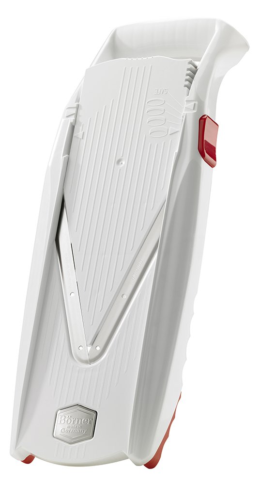 Swissmar Borner V Power Mandoline, V-7000, White is best for youColor:White Add creativity and style to your meal with the Swissmar Börner V Power mandoline. It includes three inserts for ten different cuts: a 7mm blade, 3-1/2mm blade, and a thick/thin insert for meat, allowing the V Power to julienne, shred, cube, and create French fries. A patented push-button adjustment allows you to change the size or thickness of the cut without removing the insert. The blades are made from surgical-grade stainless steel and they cut from both angles. The plane has a safety position covering the V-blade when not in use. The frame is made from tough ABS plastic with slip-resistant rubber feet. An ambidextrous food safety holder requires little pressure and holds the food in place with prongs to guard your hands from the blades. The set also includes an insert holder that doubles as a drying rack. Instruction manual included. From the Manufacturer With over 50 years of experience and knowledge, the maker of the Original V-Slicer has re-confirmed their position as the leader in the mandoline category. German made Börner V-Slicers are world renowned for their durability, precision, quality and safety. These attributes remain true with the new and innovative VPower V-Slicer that provides 10 different cuts. It features a patented push button that allows size and thickness adjustment without removing the insert. Börner’s patented safety setting provides worry-free storage that is both convenient and compact. With four fresh colors available, the strength is in the design, the power to create healthy meals is yours. Made from durable food-safe ABS plastic Blades are German-made surgical stainless steel Plane insert has a safety position, covering the V-blade when not in use Patented push button size/thickness adjustment allows for changes without having to remove the insert Slip-resistant rubber feet Patented push-button adjusts size. No need to remove insert. Protective storage box for extra inserts attaches to back of unit for compact storage. Also acts as a drying stand. Stainless steel prongs pierce food with a secure hold. Serrated edge safely and efficiently pushes food off the slicer. 3.5mm and 7mm insert blades cut from both angles. Used for julienne, shredding or cube cuts. It all started in 1956 when Alfred Börner, a toolmaker by profession, started the business manufacturing an onion cutter. This cutter was made of wood with four razor-sharp blades bent in such a way to make cutting onions into cubes easy work. This one invention sparked many more and product demand increased from all over the world. Today, Börner employs over 85 people and runs two shifts a day, six days a week to keep up with product demand around the world. Börner has become a well established company, producing state of the art kitchen tools. Börner of Germany, manufactures the finest quality vegetable slicers on the market today and are leading edge in design and technology. From the V-Slicer Pro to the Combi-Chef and Veg' Art Prep Tool, Börner products help add creativity to any gourmet meal. Swissmar has been providing quality products and service at affordable prices for more than 25 years. We are proud to be the exclusive North American partner for internationally known brands such as Peugeot of France, Börner of Germany and Dalla Piazza of Switzerland We have also developed many other partnerships throughout the world to bring you a diverse product assortment. Over the last few years, we have been expanding our own brand of Swissmar products such as raclettes, fondues, wine accessories, kitchen tools, cheese knives and accessories. You can now find Swissmar brand products in many countries around the world.