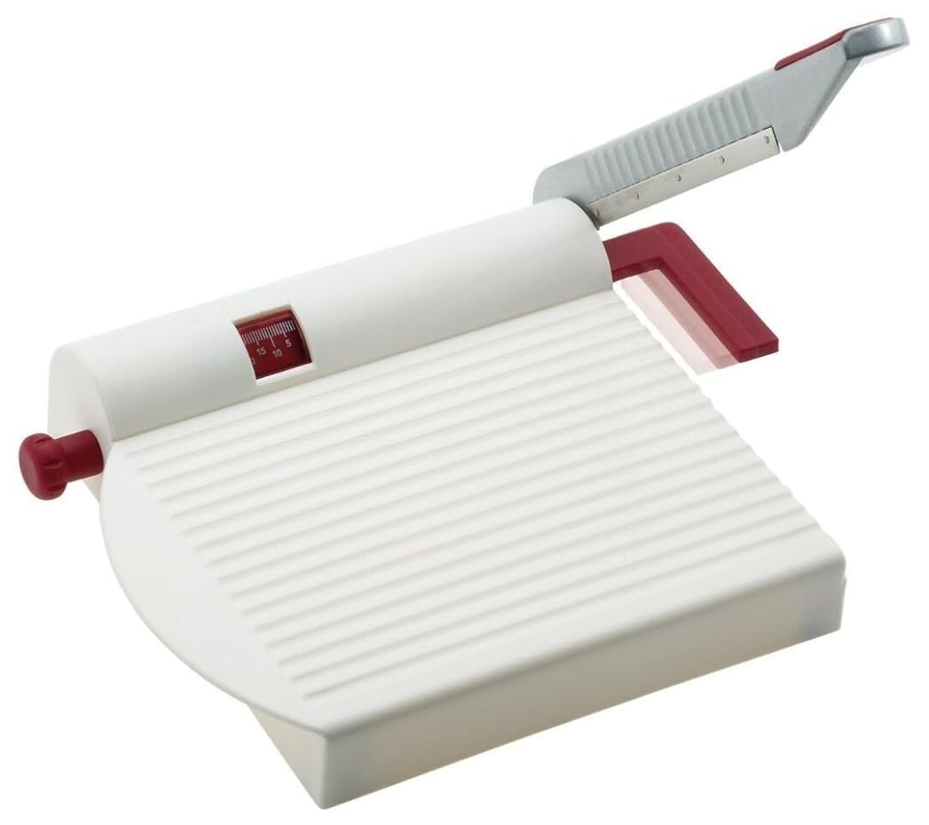 • The Westmark Germany Multipurpose Stainless Steel Cheese and Food Slicer with Board and Adjustable Thickness Dial (White) is a