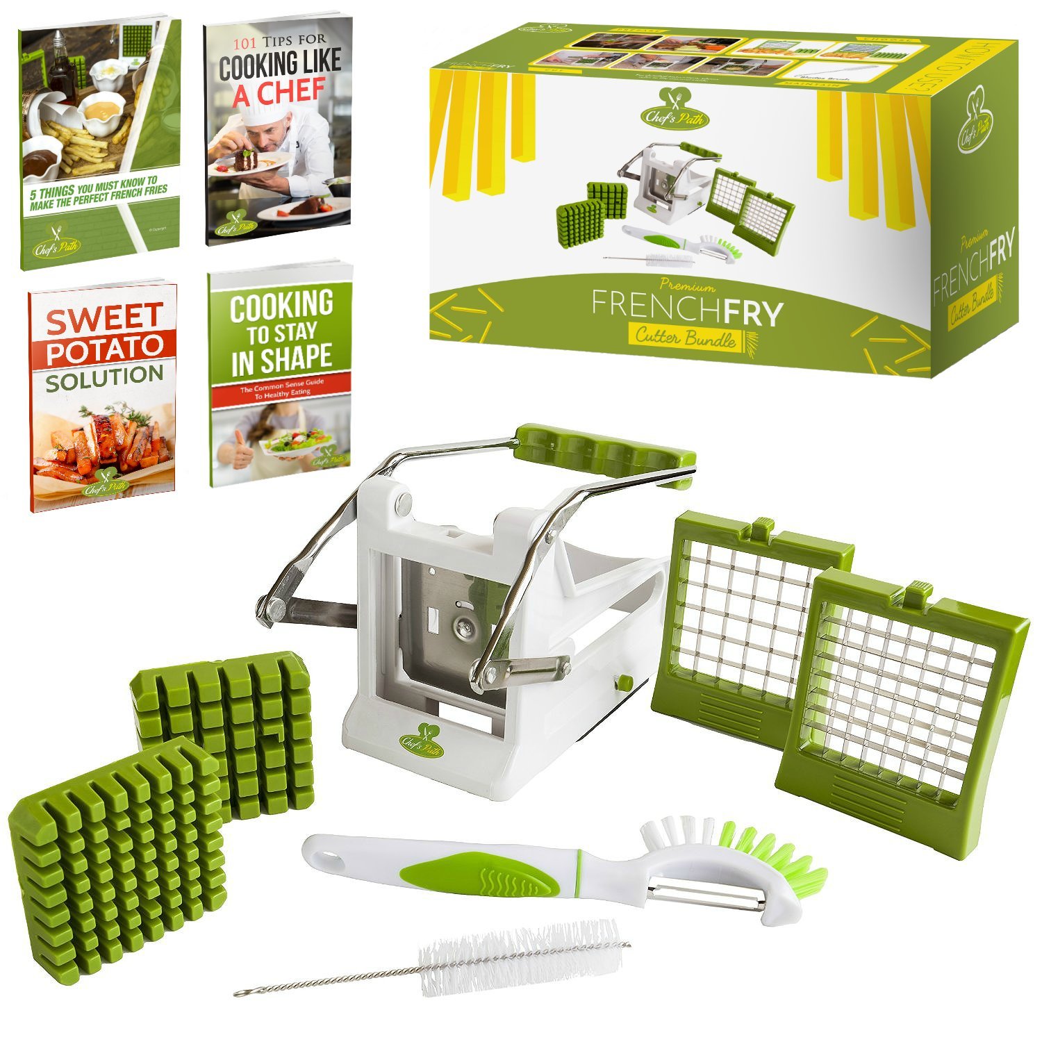 • The Chef's Path French Fry Potato Cutter Bundle:Potato French Fries/Vegetable Slicer-Chipper 2-size SS Blades Suction Base,Bonus 3in1Peeler/Eye Picker/Fruit-Vegetable Brush & Cleaning Brush,Free E-Books is a