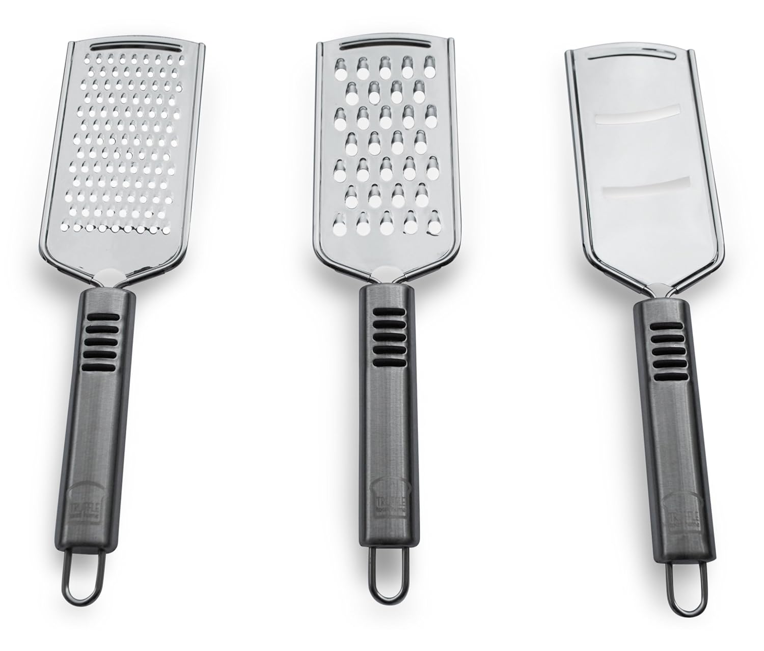 Set of 3 Professional Stainless Steel Graters for Cheese, Vegetables, Chocolate for kitchen preparation needs - Fine grater, Coarse grater and Large shaver, each with a Stylish Protective Fabric Bag is best for youThese products are highly recommended by your friends at Truffle Toast Home, an American-based company with European roots. Whether you are a casual cook or a fine chef you can count on these slicers / shavers / graters to help you preparing the best dishes and extracting all the flavors and aromas from your ingredients, limit the pressure on your hands and look good in the kitchen. At Truffle Toast Home, we are not only wine and specialty food lovers, but also design-enthusiast and quality-focused: we only propose products that we have enjoyed for years at our homes and tested extensively in our labs – and we offer an unparalleled customer service in case you do not love them as we do! TOP FEATURES: FDA food grade and Truffle Toast Home tested Professional grade quality stainless steel ensures long-lasting use Anatomic handle and non-slip rubber thumb grip improve stability, reduce pressures and protect your hands Non-clogging, razor-sharp blades for effortless grating Heat/cold resistant and scratch resistant in typical conditions of use Dishwasher safe and freezer safe Solid yet light weight (2.3 oz each) Convenient size 9.5 x 2.25 x 0.15 inches for each slicer / shaver / grater Premium appearance to match any setting and style Easy to use and easy to store in their own Truffle Toast Home fabric bags Lifetime guarantee TOP BENEFITS: Enjoy your food: flavors, aromas and taste are more vibrant with these graters and slicers Enjoy the design: elegant, sleek look and fine craftsmanship Enjoy using it: handle, thumb grip and blade design reduce the pressure on your hands Save space and time: easily store each slicer / shaver / grater in its protective bag or hang it on a hook to save space Save cleaning: easy to clean in the dishwasher Instructions: Go to our website for instructional video on how to use them