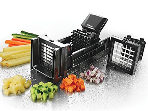 Simposh Easy Food Dicer, Black is best for youThe Easy Food Dicer cuts fruits and vegetables into cubes and wedges with ease. Dices potatoes, onions, celery, carrots, cucumbers and bell peppers as well as apples, other semi-hard to medium-hard fruits, vegetables and more. Perfect for preparing salad, french fries, snacks, side dishes, and desserts. Pressing the handle of the mechanical effort-saving ratchet-style pusher will move the food forward step by step through the sharp stainless steel blades. It makes cutting easier in a few seconds. Insert the knife guide to cut or dice the food in any length with a knife. It makes dicing safer and takes the smell off your hands. Features:- Includes 3/8' (0.95 cm) Blade & Pusher and 1/2' (1.3 cm) Blade & Pusher- Ratchet action clicks in 3/8' intervals- Simply push down on the Ratchet Handle and the Pusher advances the food through the Blades- Removable Knife Guide for even dicing- Non-slip Rubber Feet- Dishwasher safe.