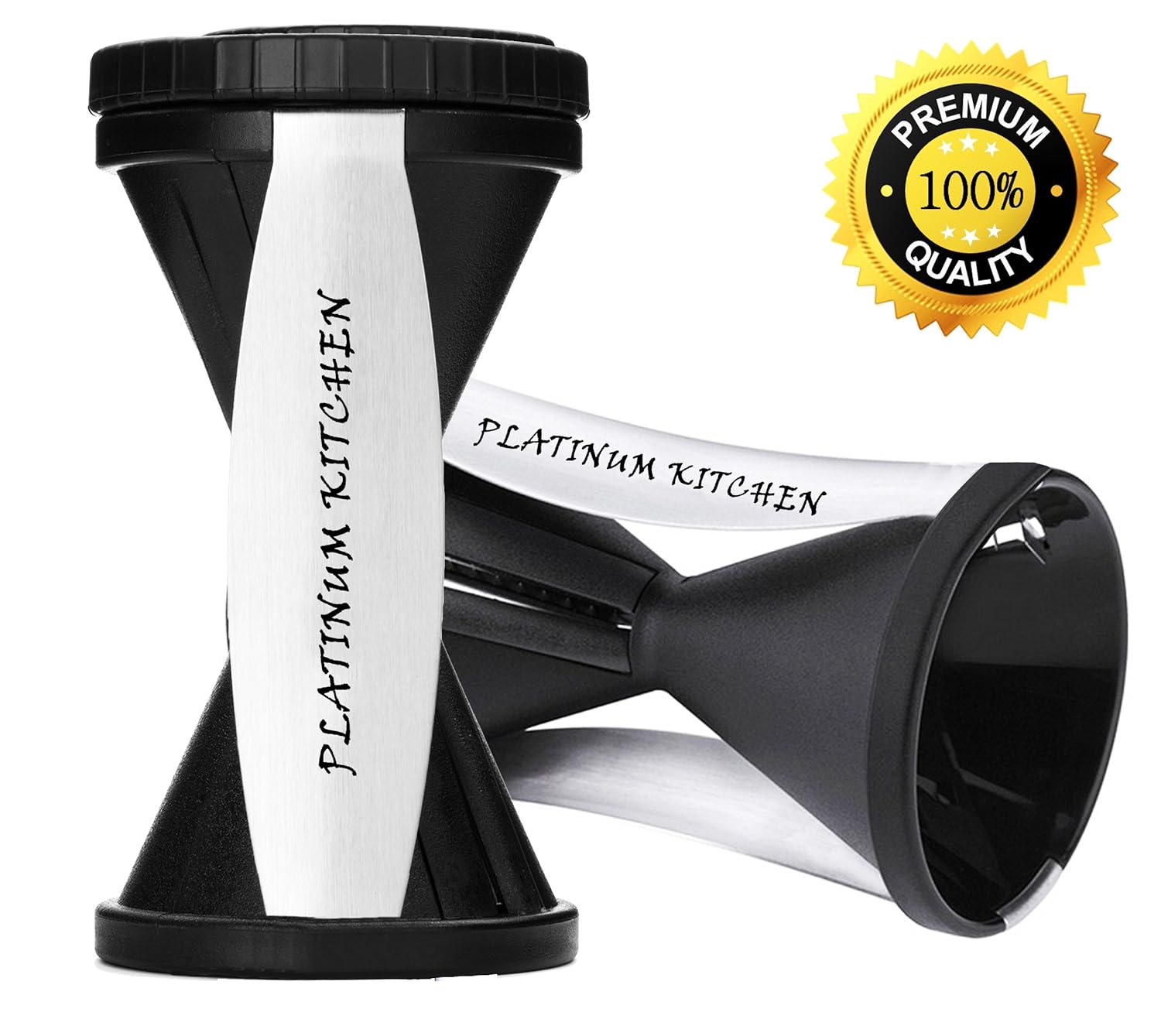 Platinum UMD® Slicer Spiralizer Bundle 5-Blades, 50% Larger, 50% Less Waste, Super Sharp Japanese Steel Blades, Paleo Recipes. Julienne Veggies. Potato, Vegetables carrots Spaghetti Florette Slices is best for youPLATINUM KITCHEN PRODUCTS UMD The #1 Tool for Making Paleo Pasta, Eating Low Carb & Going Gluten Free! Don't wait to lose weight! Start today! Here's what you can look forward to with your Platinum Kitchen 5 Blade Spiralizer PROBLEMS WITH OTHER SPIRALIZERS Just Two sizes Too small Lots of waste Torn, Uneven or Broken Noodles We've got the SOLUTION! A New Twist on Healthy Cooking! VOTED BEST NEW PRODUCT by The Gourmet Retailer! IDEAL GIFT for the home chef, healthy cook or foodie in your life Perfect for PALEO, gluten free, vegan or any low-carb eating plan Produces BEAUTIFUL LONG SPIRAL NOODLES in 4 SIZES with very little work and 8 different cut effects JULIENNE size options: 3mm-thin spirals, 6mm-thick spirals, 9mm-ribbons, 70mm- wide Creates gorgeous healthy mounds of julienne squash, carrots, zucchini, cucumbers ERGONOMIC GRIP makes it EASY TO USE with small or large hands LARGER redesigned cap protects hand and REDUCES WASTE by getting veggie farther down into Spiralizer Durable BPA free ABS plastic body with strong premium JAPANESE 304 STAINLESS STEEL BLADES Guaranteed not to rust and stays sharp over time Accommodates LARGER VEGETABLES up to 6.5cm in diameter compared to the standard 4cm EASY TO CLEAN & Dishwasher Safe Small enough to Store Away in your drawer or travel with AMAZON BUYERS TRUST OUR CUISINE PLATINUM KITCHEN BRAND TO BE QUALITY PREMIUM PRODUCTS. Special Limited Time Pricing!