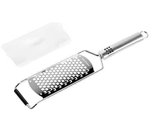 Culina Hand-held Coarse Grater 12.5" x 3". Stainless Steel. Professional-grade w/ Blade Protector is best for youSo your poorly performing plastic grater isn't meeting any of your needs? Is the plastic tool too flimsy to get any serious work done? Time to switch to a professional-grade, durable high performance tool. Culina® Hand-held Stainless Steel Professional Coarse Grater is the solution to utilitarian grating by restaurant professionals and home users alike. Its rugged construction boasts a sharp blade to efficiently string cheese, raw carrots, potatoes and more! High performance suited to daily use To try our hand-held grater is to immediately love it; don't be fooled by its elegance, Culina® is all about performance as it exceeds standard box graters in slicing swiftly and fast with little, to no effort. The comfortable 5' x 2 1/2' blade area is perfect for pizza topping or hash brown; grate over a skillet or a pasta plate. Width and length are handy for large blocks (cheese, chocolate) or smaller ingredients (ginger, nutmeg, cinnamon) or for zesting citruses. The blade is so sharp, it handles softer foods (beets, fresh out of the fridge mozzarella) without turning them into a mushy substance. Sharp Stainless Steel construction Built robust with a 18/0 Stainless Steel, Culina® graters do not bend, warp or break easily. The rugged engineering translates to a nice, hefty feel in the hand. The design is stylish and functional as a wire frame extends from the front end to form a resting bar for balance and full control grating. On the opposite end, the 5' handle offers a safe, confident grip aided by a smart rubberized thumb rest. The wide blade area displays laser cut, etched teeth ready to slice through hard to firm food. Because it is substantially sharper than non-professional graters, it comes with a protector. The blade guard covers the entire surface for a safe storage and secure handling.