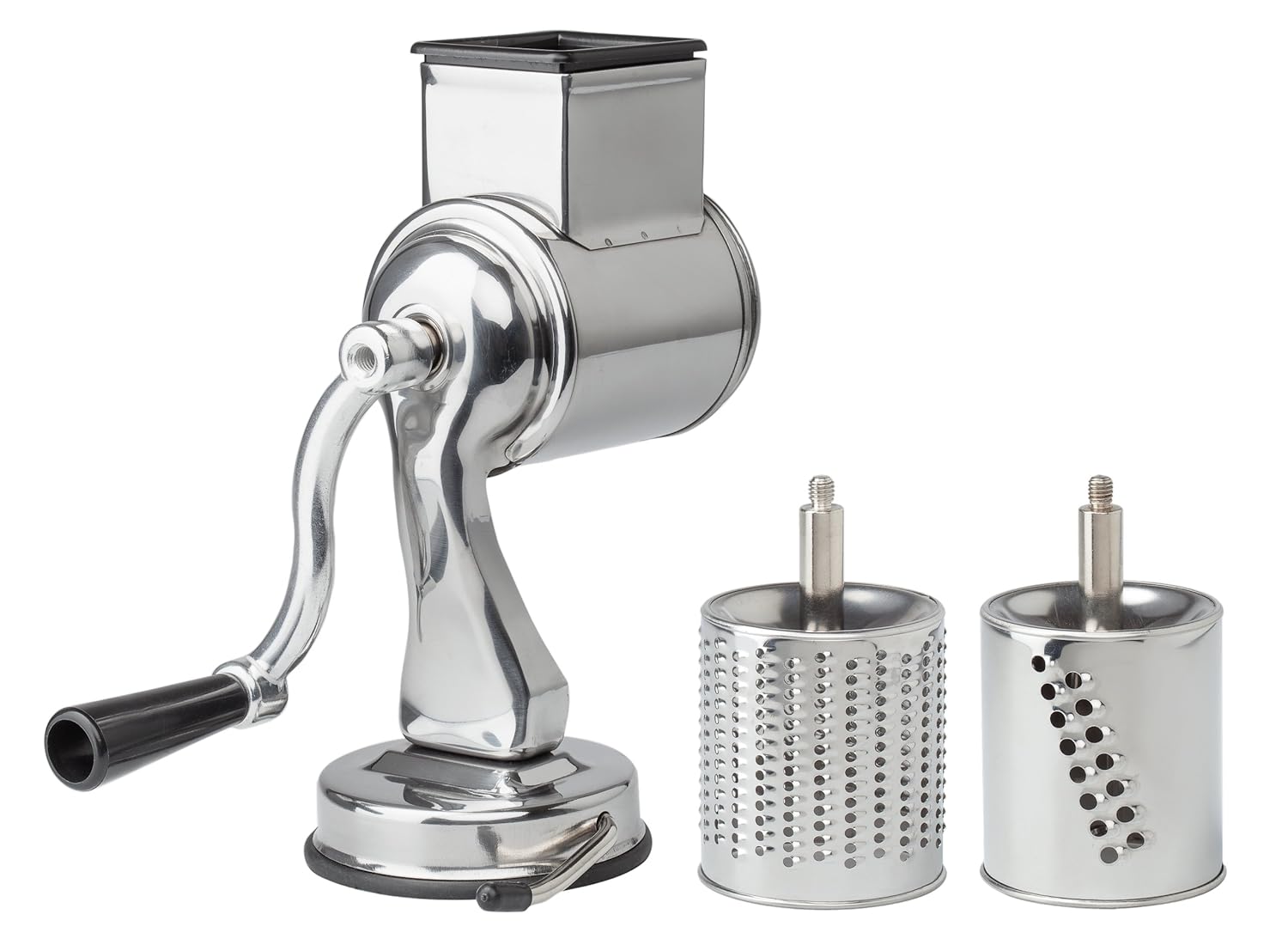 Fante's Cousin Nico's Suction-Base Cheese Grater, 2 Drums is best for youFantes Cousin Nico’s Suction-Base Cheese Grater for grating and shredding. Fresh ingredients are tastiest when prepared immediately before use, like cheeses, nuts, vegetables and chocolates. Cousin Nico’s Cheese Grater with 2 stainless steel drums makes food preparation a breeze and performs the tasks of multiple kitchen tools in one. Simply select the correct drum for the task. Use Drum ‘A’ to finely grate hard cheeses, like Asiago, Parmesan, Pecorino or Romano, or nuts, breadcrumbs and block chocolate and shred vegetables. Drum ‘B’ works like a cheese shredder, to coarsely grate semi-soft cheeses, like cheddar or firm mozzarella, and shred vegetables. Insert the drum into the grater body. Place the handle into the threaded end of the drum and turn until snug. Set the Grater’s suction base onto a clean, smooth surface and flip the locking mechanism for secure and skid-free operation. To grate or shred food, simply place it into the hopper and turn the handle, like a rotary cheese grater, and use a firm pressure. Use the safety pusher to guide food through and keep fingers out of harms way. Cousin Nico’s Cheese Grater disassembles for easy cleaning. Hand wash all parts in warm, soapy water. Do not wash in the dishwasher. Make sure to drain the suction base well. Pull the rubber base away from the Grater body about ¼-inch, and allow it to air dry thoroughly before storing. Includes Suction-Base Grater, 2 stainless steel drums, a safety pusher, and Fante’s family recipes with complete instructions.