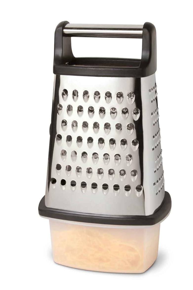 Ideas In Motion KG-12/2247 Kitchen Grater Multi Shredder with Bonus Storage Container, Stainless Steel/Black is best for youStainless Steel Multi Shredder Grater with 4 Multifunction Box Shredder/Grater/Slicer with Handle and Collection Base. Grate, Shred and More. Grate and slice cheese, vegetables and more with the handy 4-in-1 Multi Shredder . Durable Stainless steel construction with built-in handle for smooth and steady use. Grate cheese or chocolate, shred vegetable such as cabbage or lettuce, julienne potatoes, carrots, zest lemons, limes and more. All in one space saving design that is easy to use and easy to clean. Bonus storage container allows for grating, slicing and shredding directly into the container that fits conveniently under the grater during use. The container even has a lid to close it for storage of the grated food in the refrigerator.