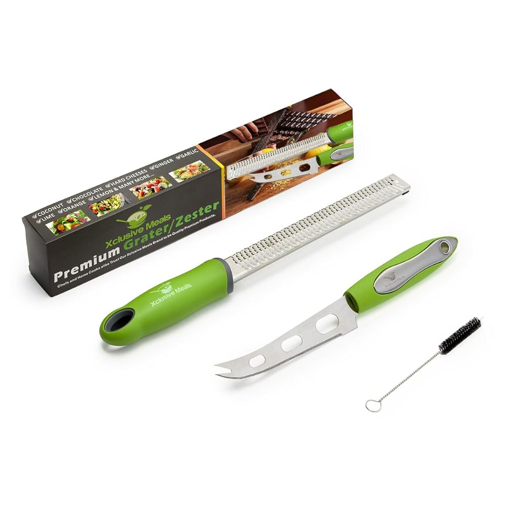 Stainless Steel Lemon Zester & Cheese Grater with Safety Cover, Cheese Knife & Cleaning Brush - For Lemon, Citrus, Parmesan Cheese, Ginger, Nutmeg, Cinnamon, Chocolate, Garlic & Veggies. is best for youDependable, function and fashionable The Xclusive Meals micro plane style Grater / Zester is the ideal tool to bring functionality and fashion into your kitchen. Durable 18/8 stainless steel makes this your go-to kitchen implement when you need a lemon zester or a cheese grater. Try freshly-ground cinnamon, nutmeg or coconut on your breakfast cereal. Sprinkle your healthy bowl of fruit with a dusting of walnuts or almonds. The Xclusive Meals Grater / Zester makes quick work of limes, ginger and garlic, and is sure to be in constant use in your home! The Xclusive Meals Premium Complete Bundle includes a lifetime-sharp fruit and cheese knife with serrated edge and unique open surfaces on the blade. A beautiful addition to your cheese board, this attractive kitchen instrument produces quick, clean slices every time. The ergonomic handle design of our grater / zester and cheese knife make them a comfortable favorite for chefs at work or at home, and their bright-green fashion hue will have you wanting to display them even when not in use. These kitchen must-haves will dazzle you and your guests. Use the included small cleaning brush to remove debris from your Xclusive Meals grater / zester and cheese knife, and then put these rust-proof tools into the dishwasher. Give yourself or the chef in your life the gift of Xclusive Meals Premium Complete Bundle today.