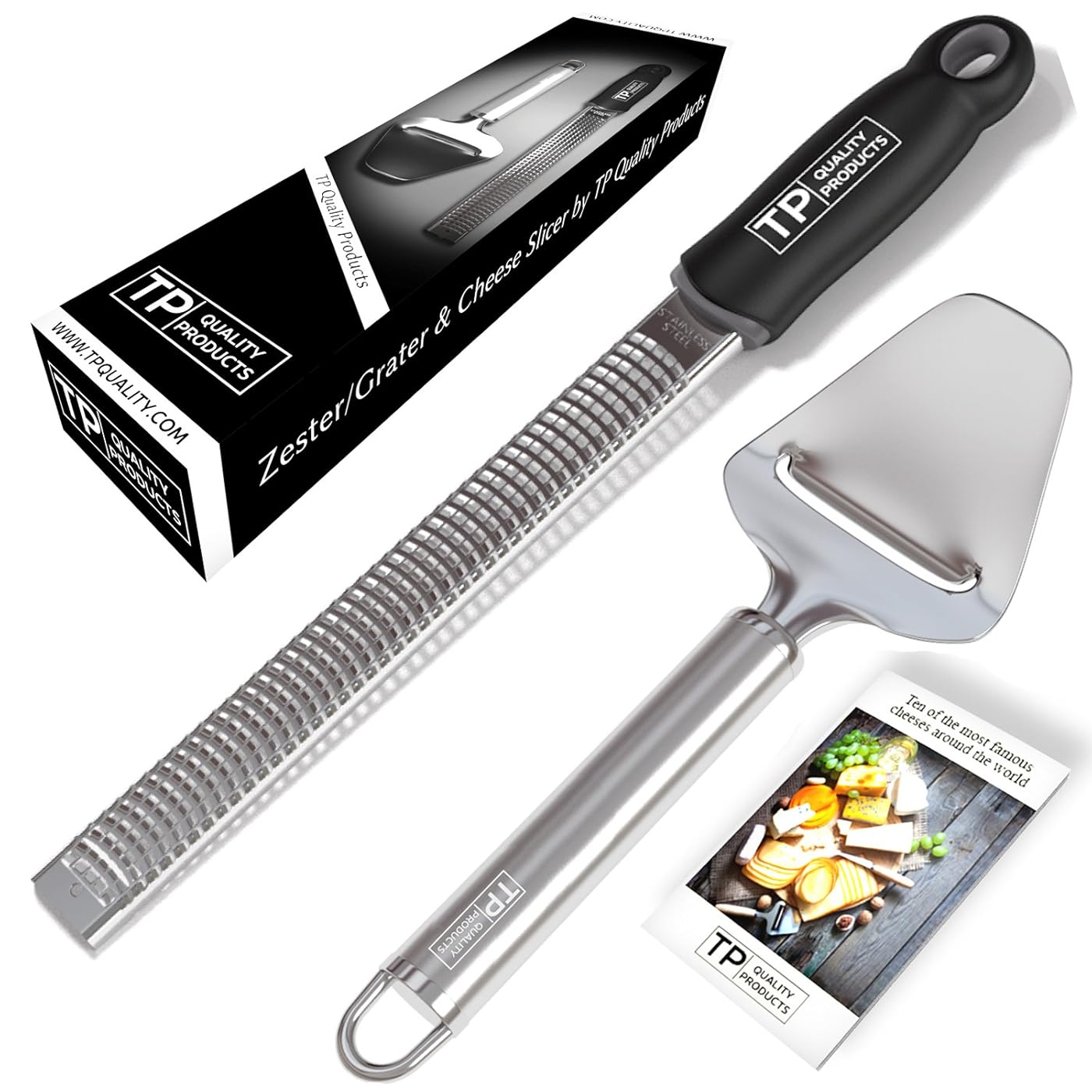 • The TP QUALITY PRODUCTS - Professional ZESTER / GRATER Sharp Blade With Non Slip Handle, Rubberized Feet, Dishwater Safe For Parmesan Cheese And Citrus + FREE Cheese SLICER With Stainless Steel Cutter is a