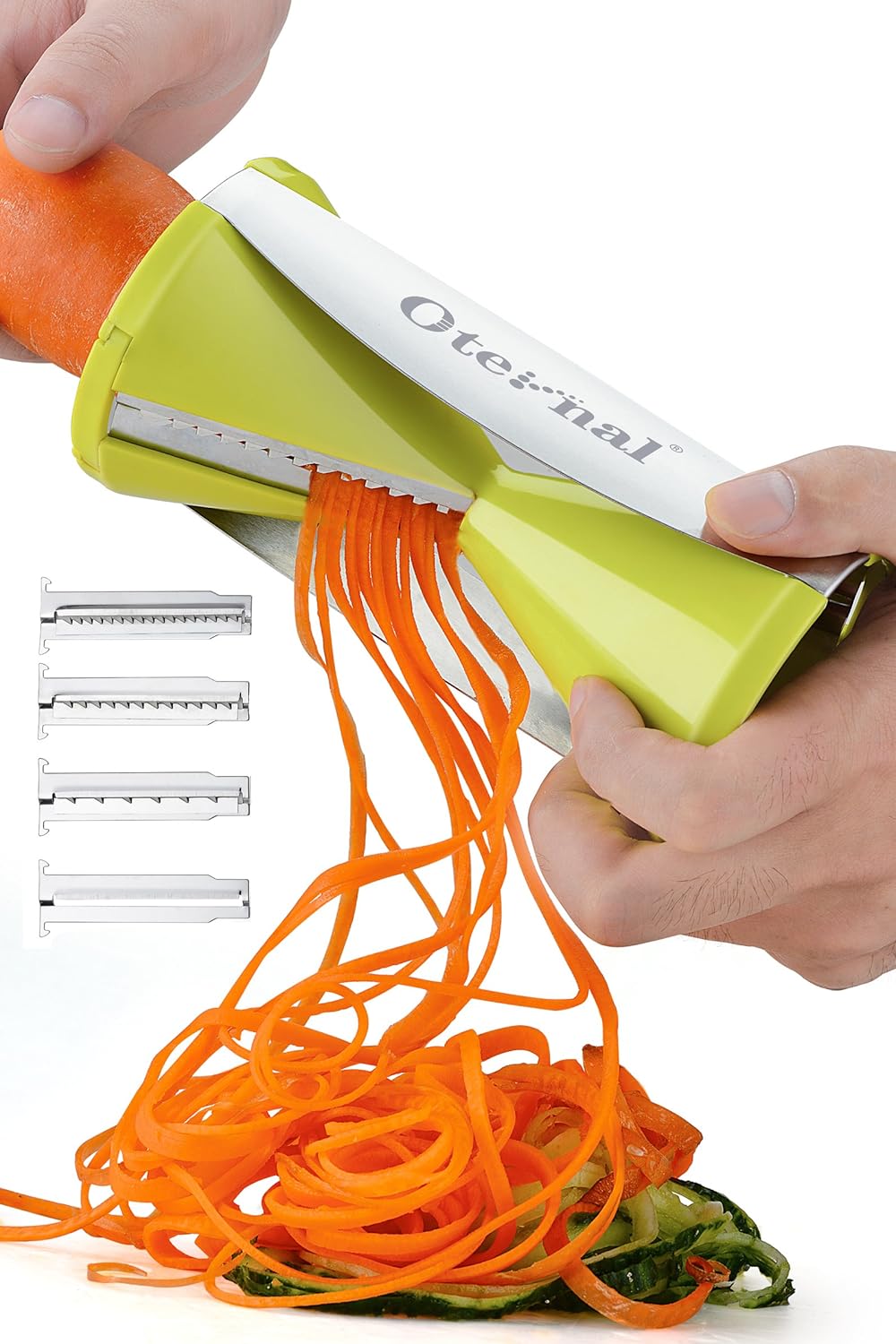• The Oternal® Vegetable Spiral Slicer Spiralizer for Spaghetti, Salad, Vegetable Noodles with 4 Stainless Steel Blade, 150% Bigger, 50% Less Vegetable Wastage, 1 Flexible Cleaning Brush, Light Green is a