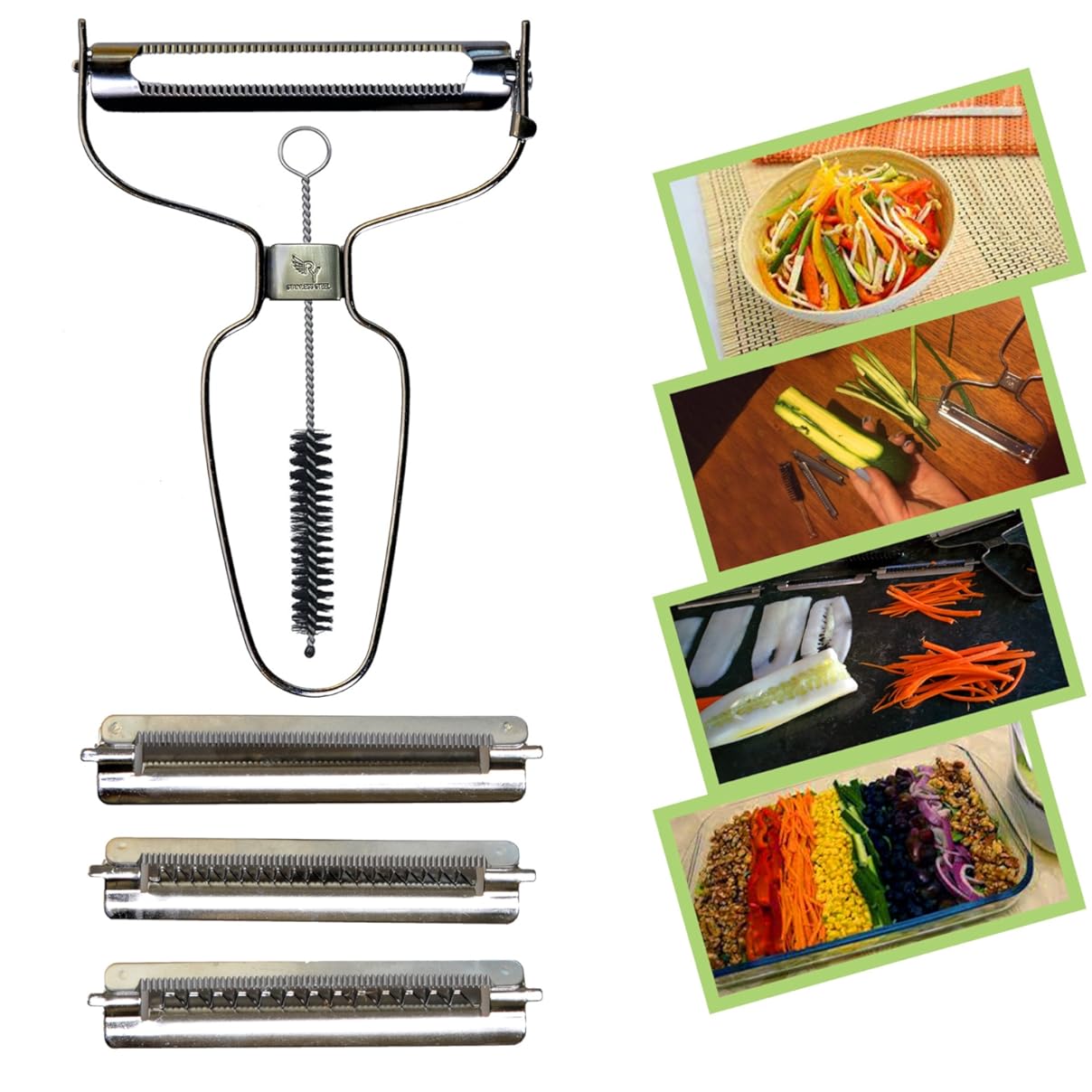 • The RAAYA JULIENNE VEGETABLE PEELER – High Quality Stainless Steel Vegetable Cutter and Fruit Slicer – Dual Blade with Cleaning Brush - Safe Lightweight, Durable & Dishwasher Safe – Maximum Satisfaction is a