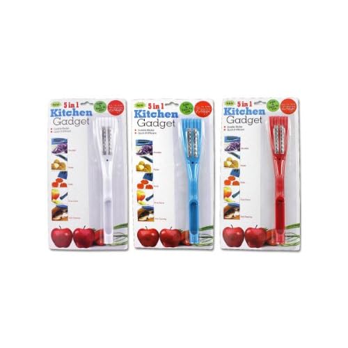 5 In 1 Kitchen Gadget is best for youThe space saving 5 in 1 kitchen gadget shreds, peels, slices, cores and cleans fish. This multi-purpose tool has durable blades and is quick and efficient. Comes in assorted colors including turquoise, red and white. Tool is packaged on a blister card with hanging hole. Measures 9 1/2-Inch from end to end.