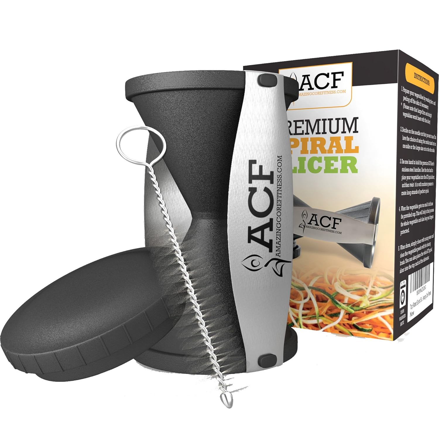 ACF Spiralizer - Vegetable Spiral Slicer - Pasta Maker -Hand Held w/ Cleaning Brush is best for youAmazing Core Fitness (ACF) is the #1 Spiral Slicer and the ONLY Slicer Sold With a Iron-Clad 100% Lifetime Warranty! -Do you want to add more vegetables to your meal or diet?-Are you exhausted of using time-consuming methods of julienning vegetable?-Is your passion for noodles holding you back from adhering to a low carb diet?-We have solved this Problem. The #1 secret to adding more delicious vegetables to your healthy lifestyle - Fast, Easy & Fun The ACF Kitchen's Spiralizer Spiral Slicer quickly transforms whole raw foods into long thin strands-Turn firm fruits and vegetable into low carb 'pasta' dishes as well as create beautiful salads-Quick cut to size the vegetables you need for stir fry dishes-Create beautiful spiralized vegetable for all of yours dishes FEATURES AND BENEFITS:-Special Sturdy Japanese Stainless Steel Blades stay sharp and do not rust-Stainless super sharp blades-Two Julienne Sizes of 2x3mm or 3.5x5mm on either ends of gadget-Easy to handle, and operate safety with built-in finger guards-Easy to clean (dishwasher safe) What's Included?-1 Premium Spiral Slicer-1 Cleaning Brush Hurry...Stock is limited! Why ACF?Only company that offers a IRON-CLAD 100% MONEY BACK GUARANTEE...If you are not COMPLETELY SATISFIED Return the item for a FULL REFUND!ACF ONLY distributes high-quality equipment to use in the comfort and convenience of your home.We offer a Lifetime No-Hassle Guarantee against our productsAll ACF Products are Built To Last! If the product breaks or is Damaged, ship it back and we will replace it for FREE Don't Wait...These won't last long! Get Your Spiral Slicer Right Now by Clicking the Orange 'Add To Cart' Button Above before we're out of stock again!