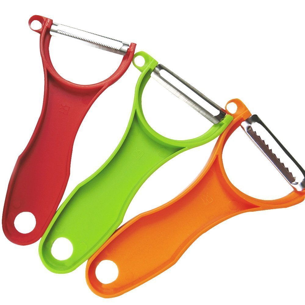 Fangfang Trio Stainless Steel Peeler Set, Easy to Julienne and Scalpel and Serrated, 3Pcs in 1 Set, Green/Orange/Red is best for youThis trio Original Swiss Peeler set features a sharp stainless steel blade, let you experience a feeling of carving art as you peel fruits and vegetable. The soft PE handle is non-slip and feel comfortable in use process. It includes: julienne peeler, serrated peeler, and scalped peeler scalpel/straight blade works well with hard fruits and vegetables such as apples and potatoes; serrated blade is great for delicate fruits and vegetables such as kiwis and tomatoes; the julienne peels thin slices of carrots and cucumbers.