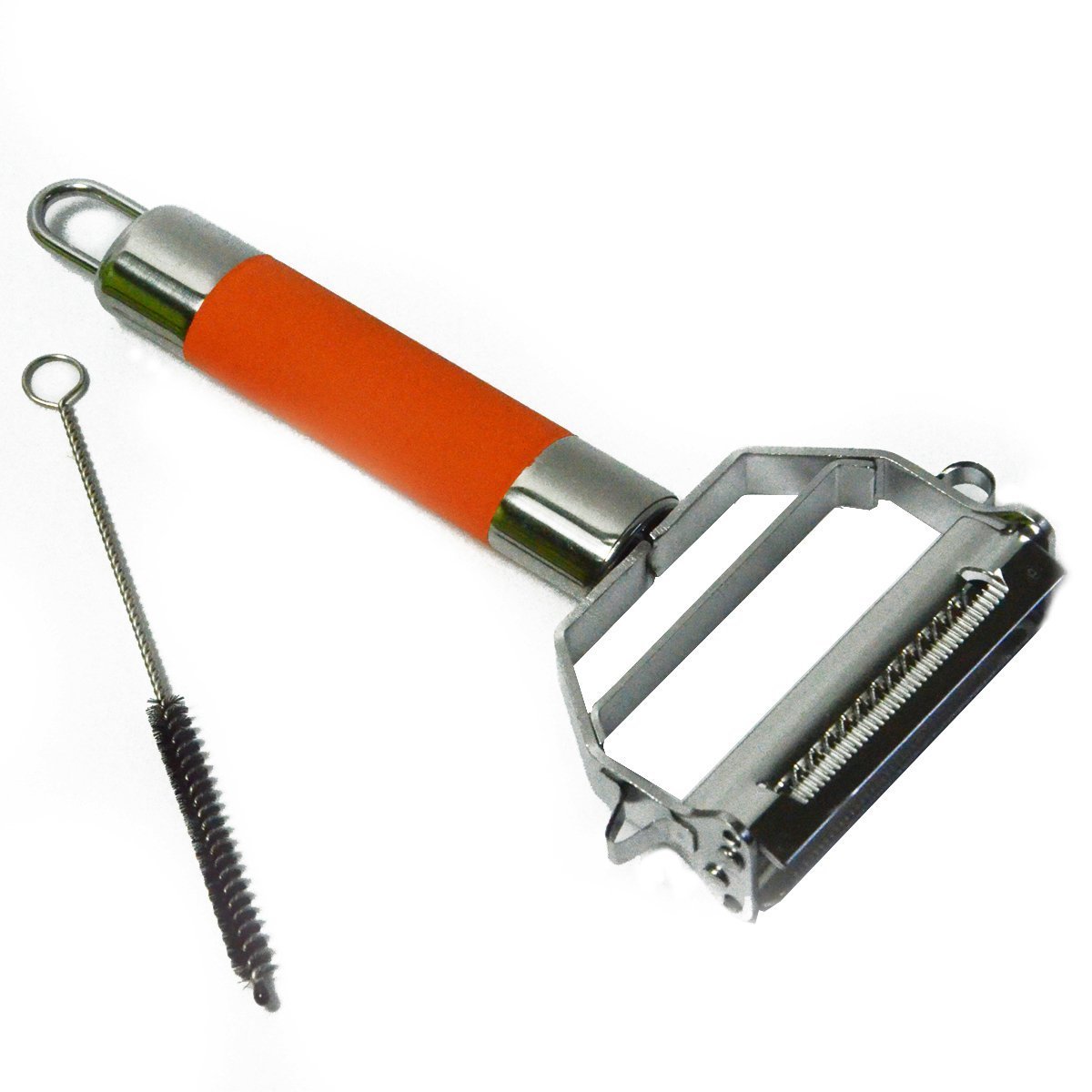 • The Julienne Peeler - Ultra Sharp Stainless Steel Dual Blade Rubber Grip Kitchen Peeler with Cleaning Brush - Three Colors (orange) is a
