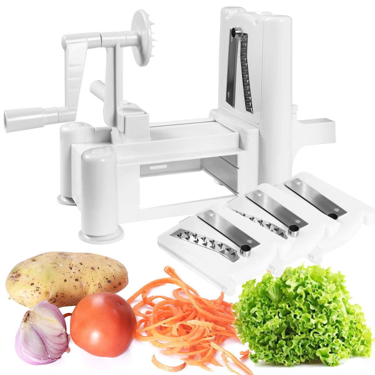Safstar Tri-Blade Spiral Vegetable Slicer Cutter Plastic Kitchen Tool is best for youFeatures: Use with a variety of fruits and vegetables including apples, potatoes, carrots, cucumber, zucchini and more Impact-resistant, BPA-free ABS plastic frame and blade plate construction Integrated storage compartment holds extra blades Powerful suction feet for stability with easy release tabs Hand operated--no batteries or AC outlet necessary Three stainless steel blades: Shredder measures 1/8': creates long, spaghetti-like spiral strands Chipper measures 1/4': creates long, thick spiral strands Straight: creates long, ribbon-like strands Additional tips: Select vegetables that are at least 1/2' in diameter Make sure the feet are suctioned firmly by ensuring the table or counter surface is dry Select vegetables that are relatively straight. Make sure that you trim enough off the ends of the vegetable or fruit to secure a firm hold onto the prongs Remove the stored blades while in use, as remnants and juices from the sliced food will dirty them Have a chopstick or any other long, narrow tool by your side to remove any remaining vegetable or fruit matter that gets stuck in the core of the cutting blade Overall Size: 12.2' X 6.2' X 9.0' Package includes: 1 X Spiral Vegetable Slicer with 3 Blade