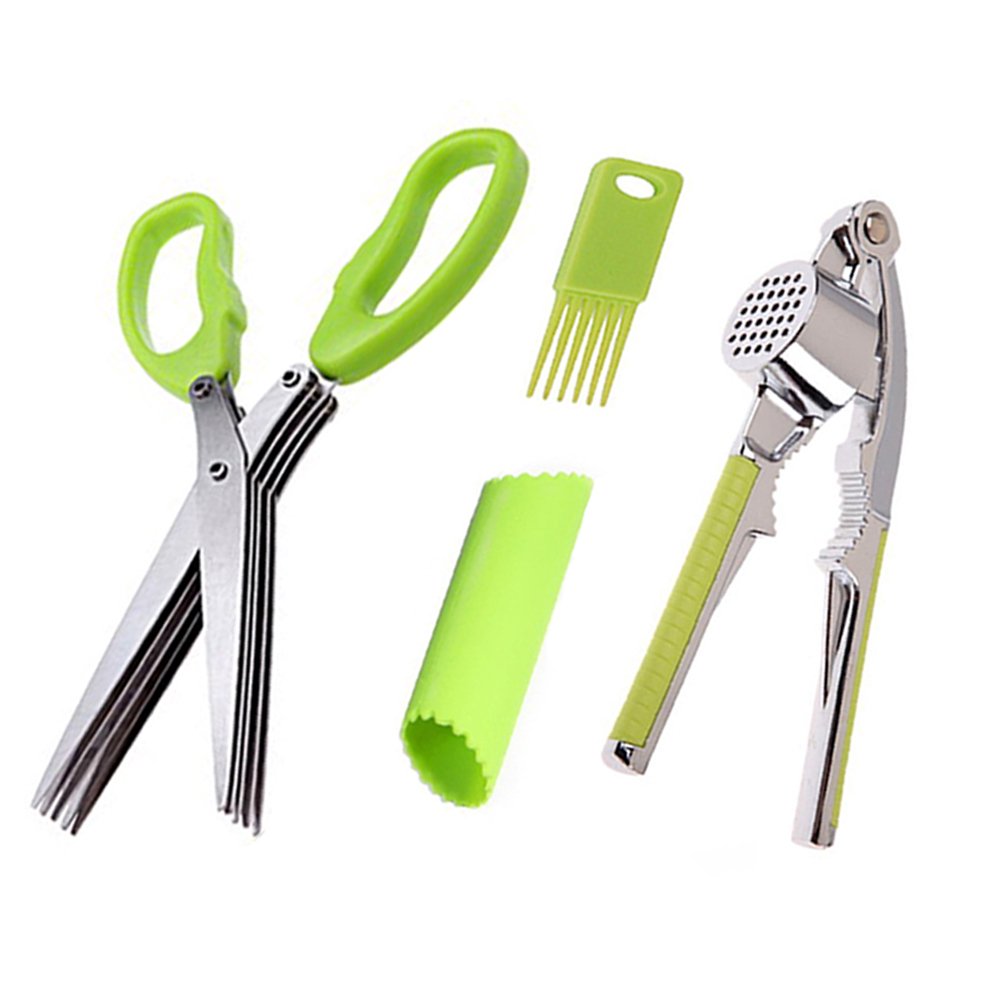 SlowTon Kitchen Seasoning Spice Tool Set, High Quality Cooking Gadgets 5 Blade Herb Scissors Shears Garlic Press and Peeler Stainless Steel Mincer Crusher and Silicone Tube Roller (Green) is best for youColor:Green Outstanding features of SlowTon kitchen tool 1. It is a reasonable kitchen ingredients kit group with a cheaper price. 2. All device are of a superior quality, which will provide long service life and never break. 3. With the SLOWTON time-saving group, adding delicious fresh crushed herbs and garlic in seconds to your meals is a simplicity. 4. Best investment ever to get free your hand and will never leave the smell on your hand. Why choose SlowTon kitchen tool? 1. Five-blade herb scissors are the best tool for chopping cilantro, green onion, basil and so on. It is fast, efficient, and you will get beautiful chopped herbs. 2. Garlic press is ergonomically designed and you will be amazed to find out that much of the garlic are squeezed out from the Garlic press without hard work. 3. Garlic peeler makes peeling garlic much faster and easy to keep your hand away from the garlic skin and the smell. The garlic peeler also can be put on the handle of pans and acts as a heat insulation because of the silicon construction. Specification: Herb Scissors: 7.5 * 3.1 * 0.7 inch (L*W*H), 4.8 oz Garlic Press: 6.6*1.7*1.4 inch (L*W*H), 6.8 oz Garlic Peeler: 5.3*1.4*1.4 inch (L*W*H), 0.9 oz Warm tips: 1. Please look out when cutting herbs, in case it cuts fingers. 2. Please rinse the herb scissors as early as cutting finished, in case herbs became dry and hard to clean. So does the garlic press. 3. Please handle a reasonable amount of herb at a time when use the herb scissors, in case too much herbs were hard to cut down. 4. Please keep the tools away from children, in case of hurt. Package including: 1* 5-blade Herb Scissors 1* Garlic Press 1* Garlic Peeler 1* Cleaning Brush