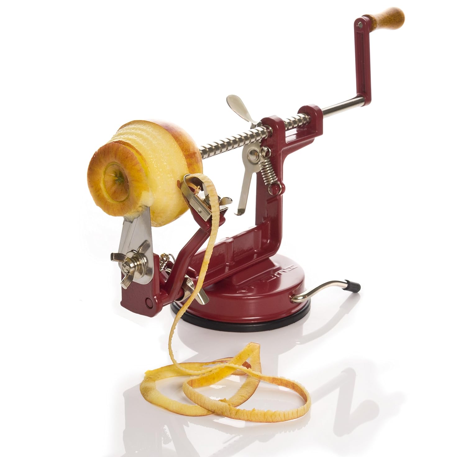 • The Vremi Apple Peeler, Slicer and Corer; Heavy Duty Cast Iron with Clamp Suction Base (Red) is a