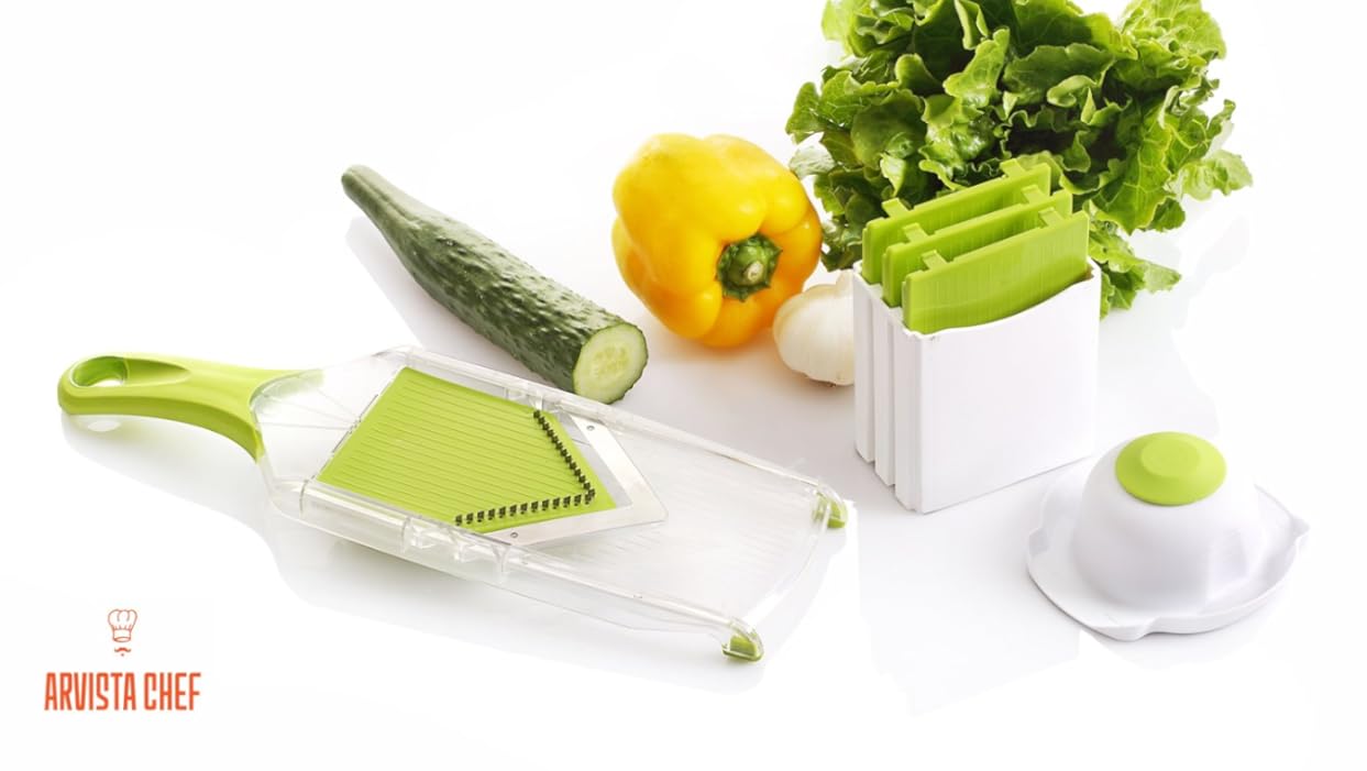 Premium Mandoline Slicer – Vegetable Slicer - Vegetable Chopper – Vegetable Cutter – French Fry Cutter – Tomato Slicer – Potato Slicer - Julienne Carrots is best for youIf you’ve ever fussed with temperamental, high-maintenance food processors, or you’ve been slaving away with nothing but a knife, some very lucky fingers and a cutting board, the SliceMan is for you! With four snap-on attachments, grippy silicone feet and a non-slip handle, this easy-to-use, easy-to-clean, convenient-to-store veggie slicer extraordinaire, the perfect fit for your kitchen. Slice and Dice: We equipped SliceMan with the sharpest blades we could find and enough attachments for you to tackle any slicing, dicing, julienne or chopping job. With a few flicks of the wrist, it’ll make quick work of the veggies of the day, whether it’s onions, tomatoes, carrots, or potatoes. (Yes, we’re talkin’ French fries or potato chips, but don’t tell anyone!) Slice In Safety: As sharp as these blades are, safety is key. That’s why we include a sturdy hand guard to keep your fingers out of the slicing zone. We also added a nice, comfortable handle that won’t slip from your grasp, and non-slip feet so the slicer doesn’t hop all over the counter while you’re working. With the SliceMan, you can prep your meals with complete confidence. No Quibble Guarantee: We hate hassles as much as you do. That’s why we’ve included a full 12-month no-quibble guarantee. If you’re unhappy with it for any reason, just let us know and we’ll promptly issue you a refund or replacement. That’s what you get when you call on Arvista Chef for your kitchen supplies. The Whole Enchilada: With the food-safe ABS plastic chopper, four easy-switch attachments, a helpful guide and an out-of-this-world warranty, the SliceMan sets itself apart from the pack as the go-to mandoline slicer for any kitchen. Add yours to your cart today. Do you know someone else who’s living in the slicing dark ages? Give a gift they’ll thank you for a dozen times over!