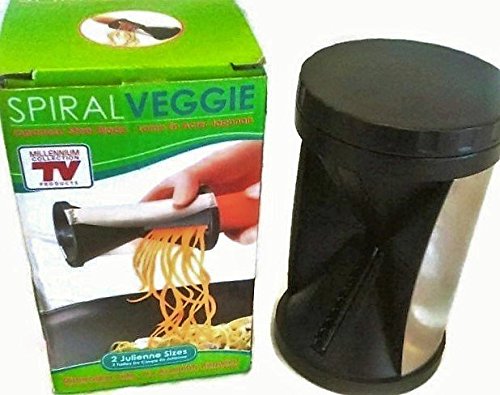 Spiral Veggie Vegetable Slicer is best for youDesign vegetable stir-fries or pasta dishes. Decorate serving dishes and garnishes. Perfect for making long vegetable strands for low carb and healthy vegetable meals. Spiral Veggie has two Julienne sizes: Spiral Cut and Shoe String Cut. As Seen on TV from the Millenium Collection.
