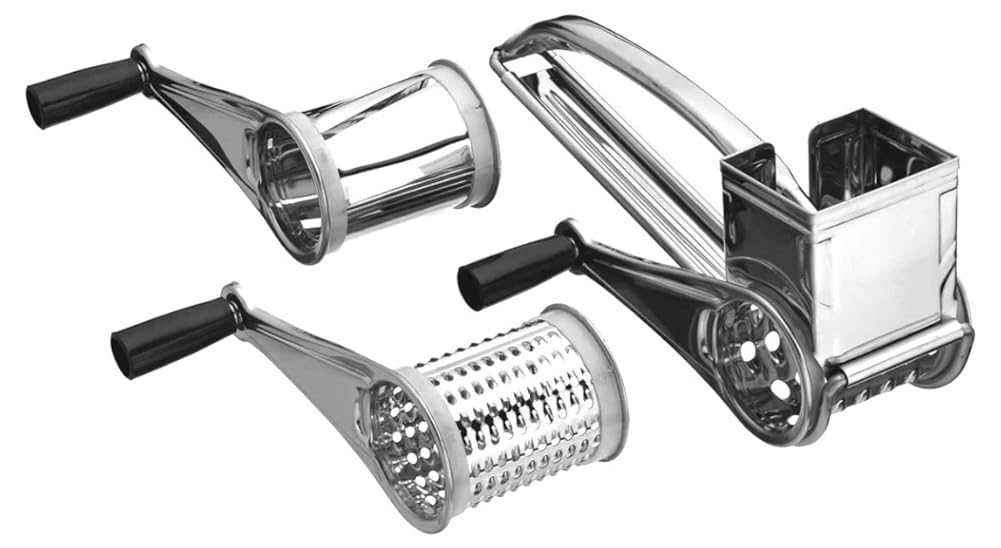 • The BleuMoo Kitchen Craft Rotary Stainless Steel Cheese Grater 3 Drums Slice Shred is a