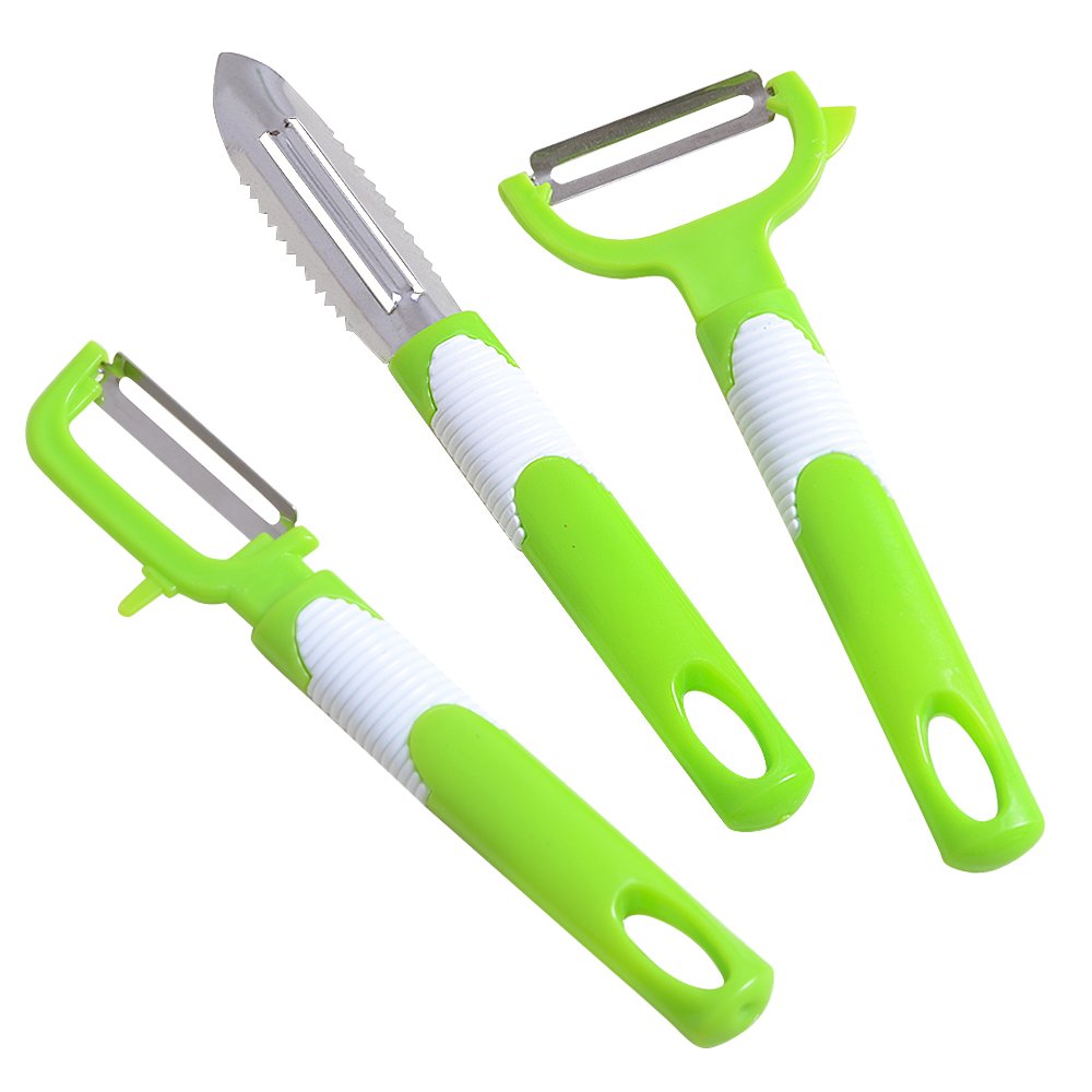 Chichic 3Pcs Fruit & Vegetable Peeler Set Stainless Steel Blade & PP Handle, Julienne and Serrated, Green is best for youDescription Includes - Handy set of 3 peelers in different forms, which meet various purposes for peeling. Material - Stainless Steel Blade & PP Handle Size - 7.5 inches & 7.9 inches & 6.9 inches Easy to clean & perfect protection, hand washing recommended Handles are ergonomic, hygienic, and slip resistant; Hole in handle for easy hanging storage