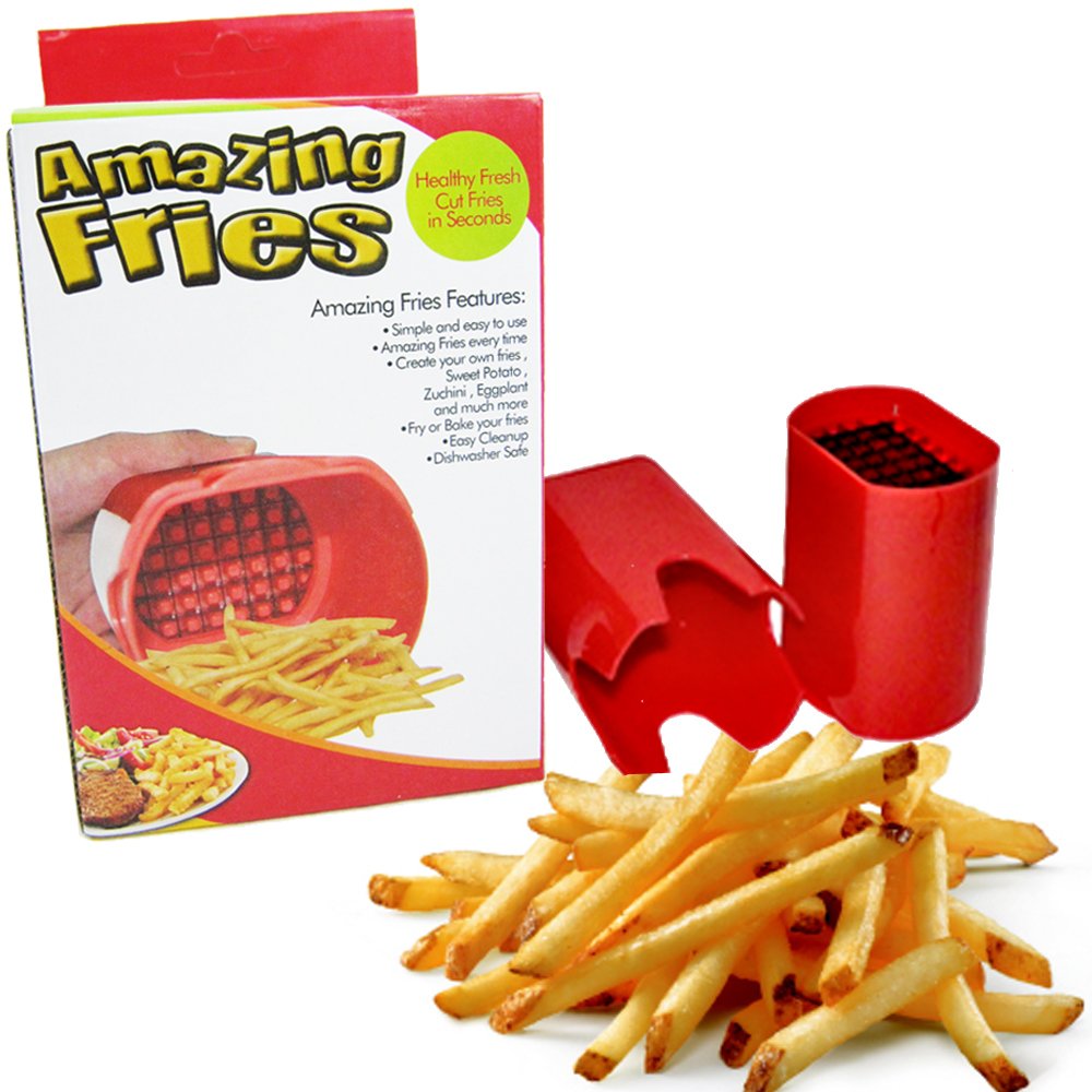 French Fry Fries Fry Cutter Potato Chip Vegetable Slicer Kitchen Tool Blade Gift is best for youNew Amazing Fries Healthy Easy To Use Fresh Cut French Fries Cutter ! Obtain the perfect cut healthy fries in seconds with this quick and easy way to prepare delicious homemade fries! Get creative! Make sweet potato, zucchini, eggplant, squash or any other type of fries you can imagine. No more tedious chopping and cutting slippery potatoes by hand. Simply cut the potato in half, place the flat surface onto the blade, insert potato into amazing fries and push down. How thin are the fries once they have been sliced? they measure 0.39' x 039' This simple and easy to use dishwasher safe tool allows you to have amazing fries every time. Preparing fries and veggies for baking, frying or dipping platters is a snap with this convenient tool. Perfect gift for all of those who love french fries. Dishwasher safe Makes a great gift