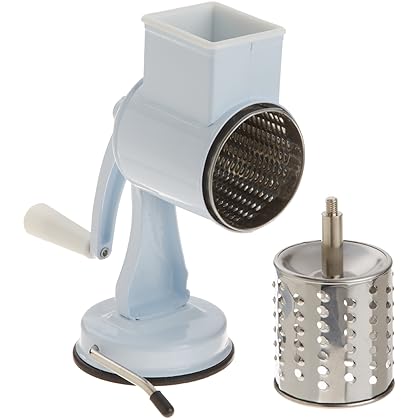 Cucina Pro Stainless Steel Grater with Two Drums and Suction Cup Mount is best for youCucinaPro Grater with white powder coated aluminum body includes two stainess steel grating drums: fine for hard cheesees, nuts and chocolate and Coarse for soft cheeses and vegetable. Strong suction cup holds grater firmly in place on counter.