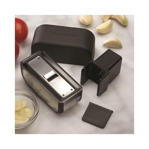 Microplane Garlic Slicer - Black is best for you48024 Color: Black The expertly engineered and seriously sharp garlic slicer transforms peeled garlic cloves into uniformly cut, delicate slices within seconds and with minimal hand contact. It eliminates the need for knife skills, or the use of potentially hazardous mandoline-like tools, to create thin slices that retain all of the aromatic's natural oils for optimum flavor. Features: -Material: Stainless steel.-Included scraper helps keep hands odor free.-Makes thin, evenly slices garlic for enhanced flavor.-Quickly slice 2 - 3 peels cloves at a time.-Product care: Top rack dishwasher safe.-Made in the USA.-Product Type: Slicer and cutter.-Collection: .-Finish (Color: Black): Black.-Finish (Color: Red): Red.-Hardware Finish: .-Base Material: Stainless steel -Base Material Details: Stainless Steel..-Handle Material: Plastic -Handle Material Details: Plastic..-Hardware Material: .-Number of Items Included: 1.-Pieces Included: .-Antimicrobial: No.-Rust Resistant: No.-Scratch Resistant: No.-Shatterproof: No.-Stain Resistant: No.-Anti-Slip Base: No.-Wattage: .-Voltage: .-Operation: Manual.-Power Source: .-Battery Required: No -Battery Type: .-Batteries Included: .-Number of Batteries Needed: .-Rechargeable Batteries: ..-Cutting Wires Included: No -Number of Cutting Wires: ..-Compatible Wire Part Number: .-Food Compatibility: Garlic.-Cheese Type: .-Item Type: Handheld.-Soft-Grip Handle: No.-Dishwasher Safe: Yes.-Outdoor Use: No.-Commercial Use: No.-Recycled Content: No -Total Recycled Content (Percentage): .-Post-Consumer Content (Percentage): .-Remanufactured/Refurbished: ..-Eco-Friendly: No.-Product Care: top rack dishwasher safe.-Country of Manufacture: United States.Specifications: -OSHA Compliant: No.-FDA Approved: No.-BPA Free: Yes.-ASTM Compliant: No.-NSF Certified: No.-PTFE Free: No.-PFOA Free: No.-California Proposition 65 Warning Required: No.Dimensions: -Overall Height - Top to Bottom: 3.5.-Overall Width - Side to Side: 1.5.-Overall Depth - Front to Back: 3.