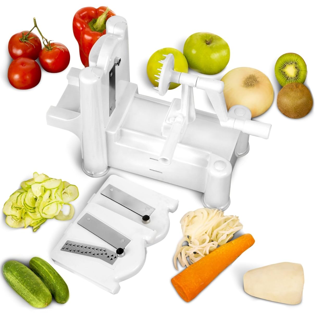 You buy Recipe E-book Included! The Crafty Kitchen Tri Blade Vegetable Slicer – Spiral Cutter – Spiralizer for Vegetables, Fruit and Raw Food Cuisine - Gluten Free Pasta - Zucchini Noodles - Mandoline - Create Healthy Gourmet Meals with Zero Risk - 100% Lifetime Guarantee with Coupon : AOO30 will be discounted 30% price an easy-to-use, handy tool that makes zucchini spaghetti, cucumber ribbon strands, curly fries or long, spiral apple strands. It comes with three blades: a shredder blade (small holes), a chipper blade (large holes) and a straight blade. A storage compartment beneath the frame stores two blades and the third blade comes already in place.