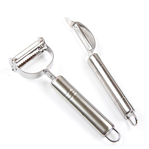 Cimostar Stainless Steel Sharp Y Shaped Potato Peeler & Vegetable Peeler - Julienne Peeler with Ultra Sharp Blade Technology - Set of 2 is best for youEVERY KITCHEN NEED THIS PERFECT PEELER! You can stop looking. These will be the last peelers you'll ever need! These large peelers have very special features: - You'll be amazed at how comfortable of a grip they have, designed for all hand sizes - You'll notice how sharp both stainless steel blades really are - The black and white elegant design will capture your eye. - The Y shaped blade has a sharp built-in core remover for potatoes, apples or any other fruit and vegetable. - By designing a big blade, backed by a robust, durable and well-shaped frame, you'll be amazed at the effortless hand movement required. - The peelers rip the skins right off of your vegetable the very first run, no need to repeat. - You'll notice how powerful they are; yet how gentle they feel in your hand. This is why we can offer a Money Back guarantee. Order one today for yourself, or more for friends and family!