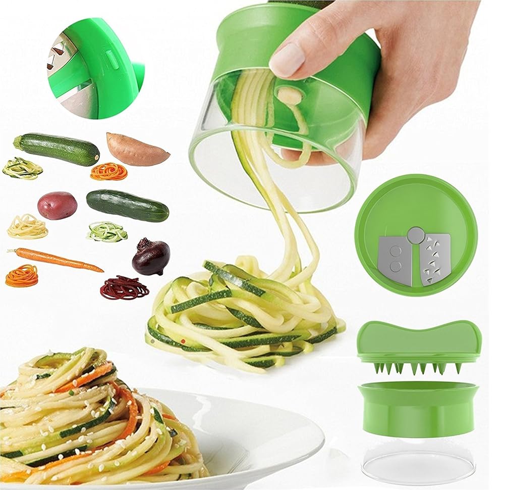 You buy HENGSONG Green Spiral Cutters Hand for Vegetable Potatoes Slicer Peeler Carrot Peeler with Coupon : AOO30 will be discounted 30% price an easy-to-use, handy tool that makes zucchini spaghetti, cucumber ribbon strands, curly fries or long, spiral apple strands. It comes with three blades: a shredder blade (small holes), a chipper blade (large holes) and a straight blade. A storage compartment beneath the frame stores two blades and the third blade comes already in place.