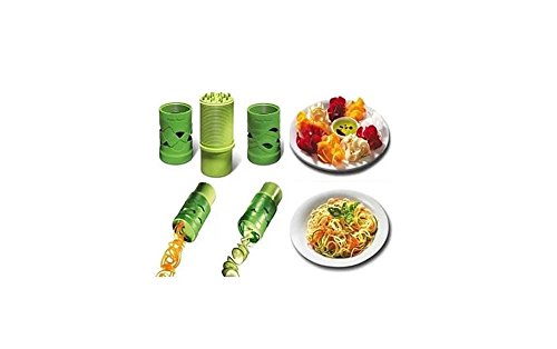 VEGGIE MAGICAL SLICER and Salad Decorator is best for youVeggie Magical Slicer and Salad Decorator. Make your veggies fun to eat, enjoy the vegetable like never before. Veggie Magical Slicer and Salad Decorator is safe and easy to operate like a child's play. Simply take the piece of your favorite vegetable, fix it on the fixture pins and twist. Make spiral shapes out of Cucumbers, Carrots, Sweet Potatoes and Radishes to make healthy salads and make spaghetti shapes out of Zucchinis to make raw pastas, peel Onions fast without cutting them through open sharp knife which is unsafe and makes you cry. But those same Onions will make you smile when you twist them through the Veggie Magical Slicer and Salad Decorator. Present your already delicious food by ALSO making it look delicious by decorating it in seconds like a professional chef with the Veggie Magical Slicer and Salad Decorator. Details: Interchangeable heads for Spaghetti and Spiral shaped vegetables. BPA FREE Plastic body and fixer pins. Handy tool, easy to use. Easy to clean, dishwasher safe. Compact to store. Comes in Organic green color.