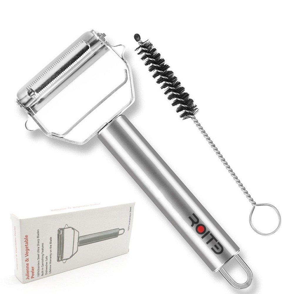 ROITB Premium Food grade stainless steel Julienne Peeler & Vegetable Peeler with Cleaning Brush is best for youJulienne Peeler, Zucchini Slicer, Vegetable Peeler, All in One! The ROITB Stainless Steel Kitchen Tool is great for Potato, Apple, Squash, and as a Carrot Peeler, Citrus Garnish Tool, and for Creating Zucchini Noodles: - Perfect for vegan, vegetarian, low carb diet, ideal protein or paleo diet. - 100% stainless and very sharp steel blades. - An essential kitchen gadget that allows you to peel and julienne vegetables quickly and beautifully. Offers the most needed features such as slicing, peeling, julienne, and garnishing in one handy cooking gadget. Are you low carb cooking or searching for vegan gifts for your family? - Create restaurant-style noodles from vegetables quickly and easily. - Great for apples, squash, citrus, zucchini, parsnips, sweet potatoes, squash, zucchini, carrots and many more of your favorite vegetables. - Even cheeses and chocolates can be shaved and sliced. Whether you're following a paleo-, vegetarian-, vegan-, or just healthy- diet, you can now create delicious, elegant restaurant-style vegetable strands as an alternative to traditional pastas that your whole family will love. Julienned vegetable noodles are great as a healthy main dish, side dish, or garnish. - NOTICE: This kitchen tool has very sharp blades. To ensure safety while using this tool, we recommend holding down vegetables on cutting board using a fork instead of holding in your hand. Safety first! You will start getting healthier once you start using your new julienne vegetable peeler!