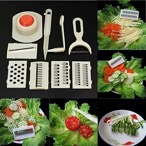 Saver 11 in 1 Kitchen Multifunction Fruit Vegetables Slicer Cutter Shredder Peeler is best for youDescription: Performs many of the functions of a food processor The hands would not get hurt by using safe handle Fruits and vegetables can be sliced into different shapes Easy to operate, Interchangeable Blades for a wide variety of garnishing Great Slicer for Home Cooking or Restaurant or Bar Features & details: Material: ABS Plastic & Stainless steel Weight: About 170g Color: As shown in pictures Package Included: 1pcs X Mainboard(About 24.5x9cm) 1pcs X Silk Knife 1pcs X Wipe Knife 1pcs X Chafed Knife 1pcs X Thick Knife 1pcs X Thin Knife 1pcs X Slice Knife 1pcs X Paring Knife 1pcs X Circular Knife 1pcs X Flower Arranging Knife 1pcs X Protecting Hands