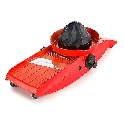 Global home Easy Hold Mandoline Slicer with Lemon Squeezer TNS 3000 All in one Red is best for youConsistent slices add that visual flair to any dish. From tomato slices to king-size french fries, this slicer can come in handy for a variety of meals. And, the hand guard also acts as a juicer for adding a little zest to your recipes. What You Get Slicer Set of blades Lemon squeezer/pusher Instruction sheet Features Perfect for slicing vegetables, fruits and cheeses Lemon squeezer extract the juice from lemons and other fruits Squeezer also acts as a safety guard Set thickness from 1–7mm with the adjustable blades Specifications Color: Red Model #: TNS3000 Measurements: Approx. 13-1/2'L x 5'W x 2-1/4'H Material Composition: Stainless steel and plastic Care: Hand wash in cold or lukewarm water Country of Origin: Germany