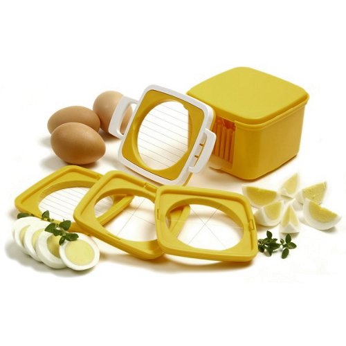 Norpo Yellow 5 Piece Egg Slicer Set with Storage Case is best for youEasily slice, wedge, and dice eggs while using this five piece slicer set from Norpro. Included in the set are four yellow frames with stainless steel wires and a storage case to hold it all in between uses. Create shapes such as wedges, quarter, vertical, and horizontal, or combine two line frames for cube diced bits. In addition to slicing eggs, this set is also great for use with strawberries, kiwis, bananas, soft cheese and more.5-1/2' L x 3' W x 4-1/4' H