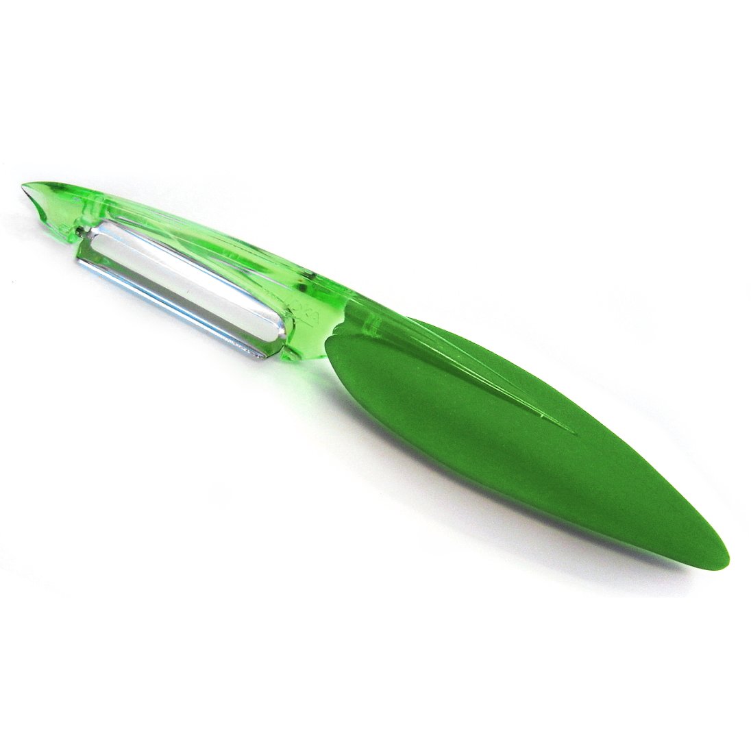 Orka Stainless Steel and Silicone Swivel Peeler is best for youPeel your potatoes and vegetables easily with this Swivel Peeler from Orka. The peeler features a stainless steel blade that peels from both sides and pivots for added control and accuracy. Also, the ergonomic silicone handle fits easily in your hand to give you a better grip. The peeler also has a very durable tip that will allow you to get out eyes of potatoes as well.